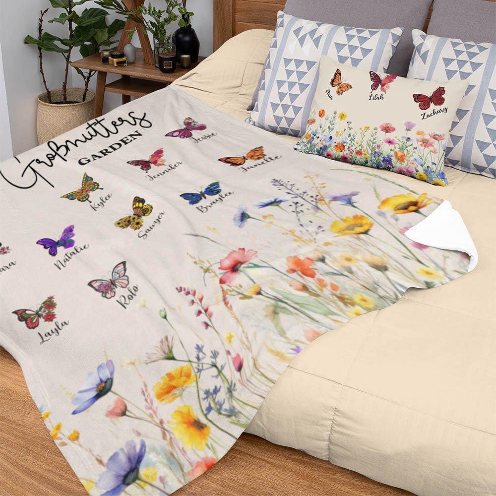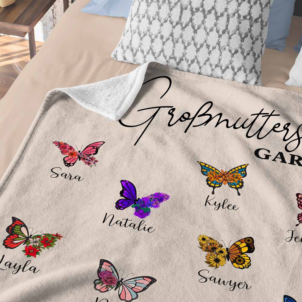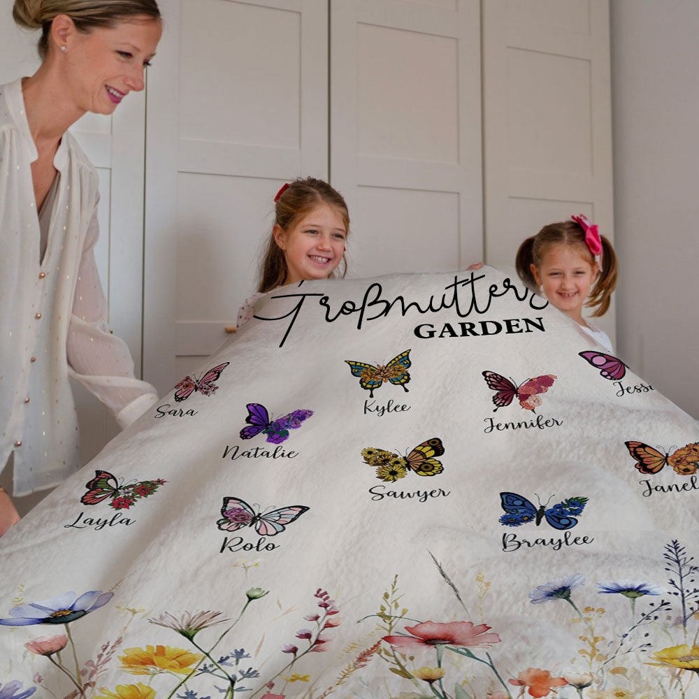Die Wärme und Liebe der Familie inspirierte das Design dieser Decke. 1-10 lebensechte Schmetterlinge sind mit schönen Blumen gepaart; jeder Schmetterling steht für ein Familienmitglied und symbolisiert die Einzigartigkeit und Beweglichkeit jedes Mitglieds. Sie können den Namen jedes Familienmitglieds nach Ihren Wünschen anpassen und "Wessen Garten" als Thema wählen, um die Decke noch individueller zu gestalten.
