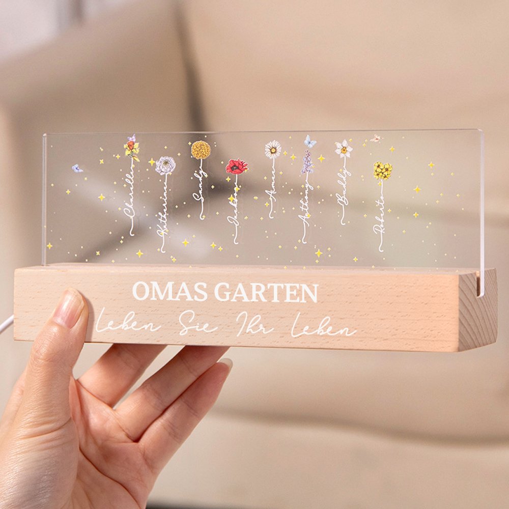 Jede Blume steht für ein Familienmitglied und bildet einen leuchtenden Stammbaum, der Wärme und Liebe verströmt. Das sanfte LED-Licht hebt die filigranen Blumenmuster hervor und verbreitet in jedem Raum eine behagliche, beruhigende Atmosphäre. Es ist nicht nur ein Nachtlicht, sondern eine leuchtende Hommage an die familiären Bande und die wertvollen Erinnerungen.