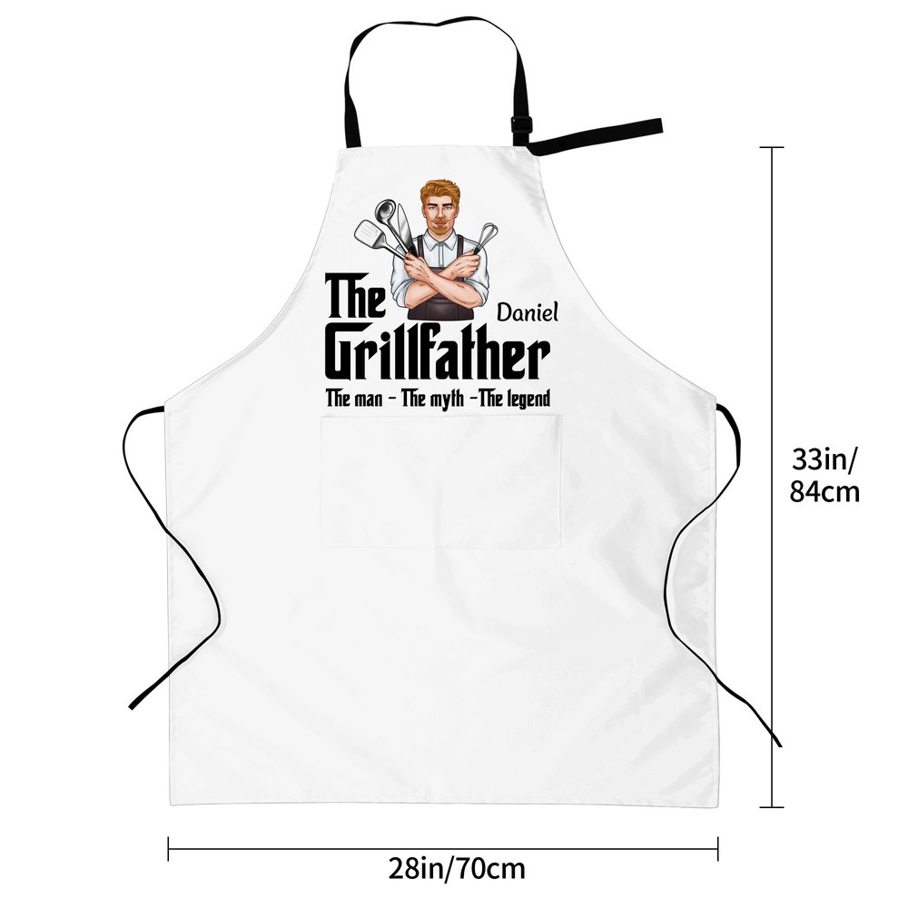 Die Vorderseite dieser Schürze zeigt die verspielte Grillfather-Figur und einen humorvollen Slogan: "Der Mann - der Mythos - die Legende." Individuell anpassbare Namen verleihen der Schürze eine einzigartige Note, die Humor und Personalisierung nahtlos miteinander verbindet und die Freude am Grillen einfängt.