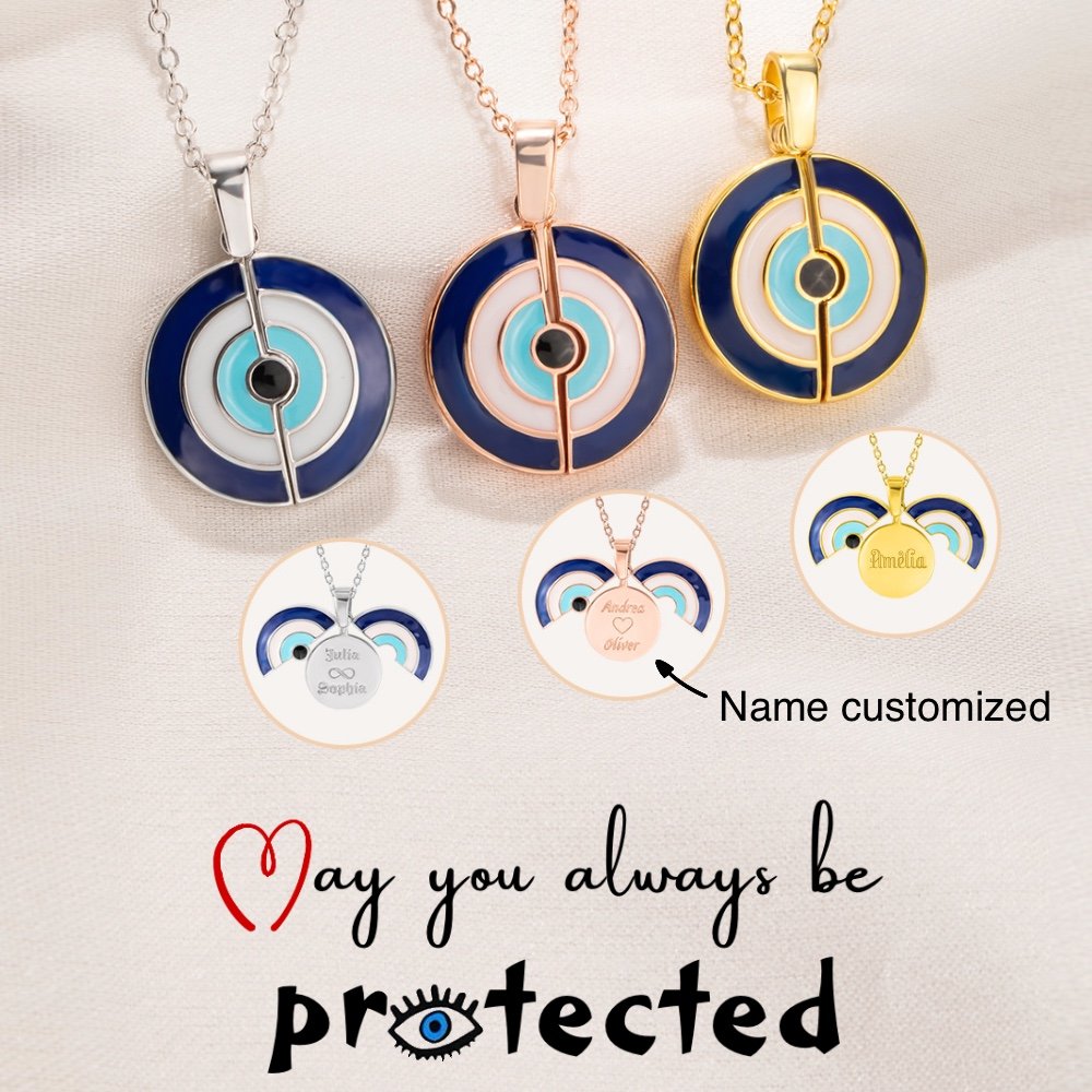 Das Design unserer Halskette ist vom geheimnisvollen Symbol des "bösen Blicks" inspiriert, das als Schutzsymbol gilt, das spirituellen Schutz bietet und jegliche negative Energie, die auf Sie gerichtet ist, vertreibt, so dass Sie sicher sein können. Die Halskette enthält auch ein "Medaillon"-Element, bei dem das äußere böse Auge geöffnet wird, um eine Scheibe zu enthüllen, die als Unendlichkeits- oder Herzsymbol ausgewählt oder mit einem Namen oder einer Passage eingraviert werden kann, was bedeutet, dass die Person oder Sache durch das böse Auge geschützt werden kann.