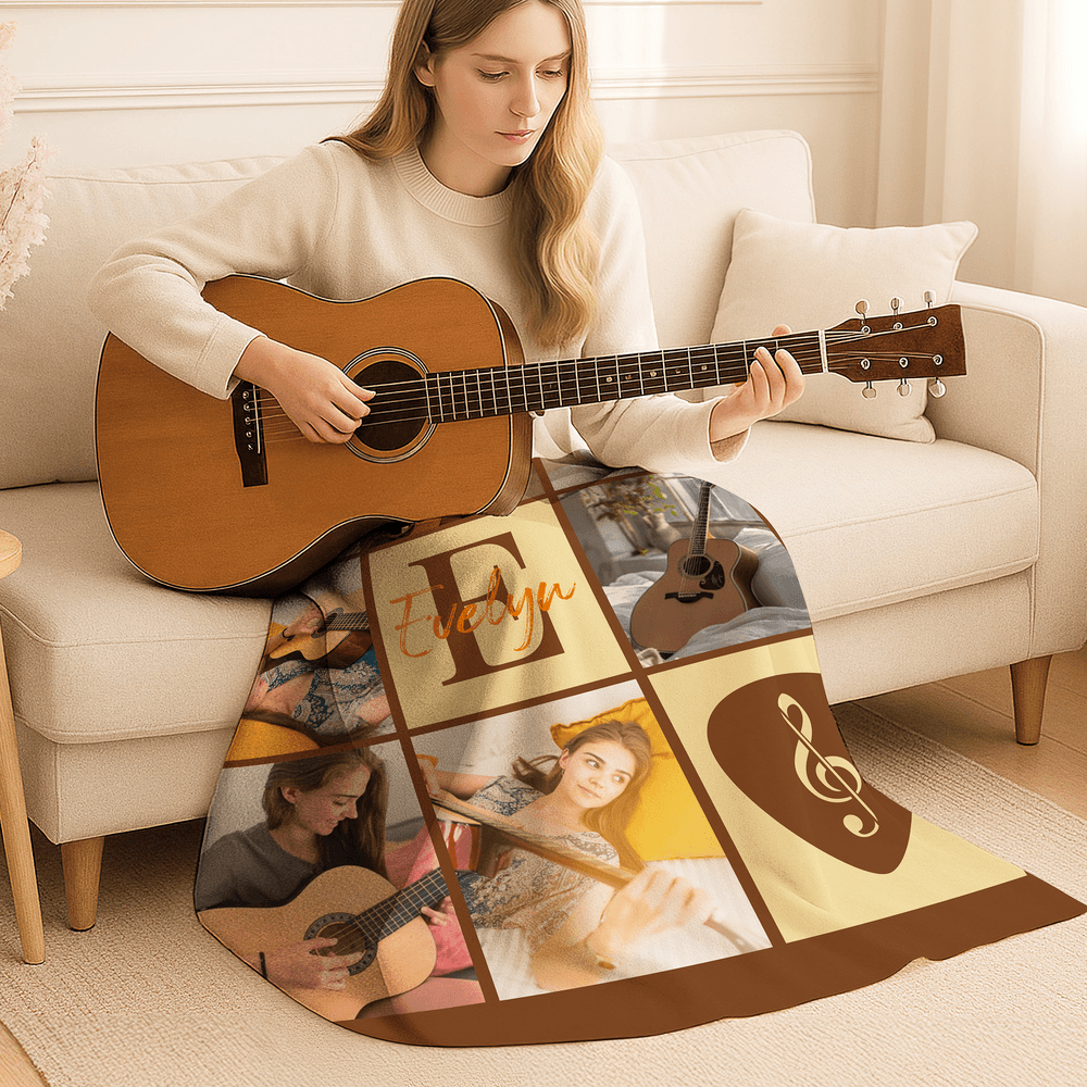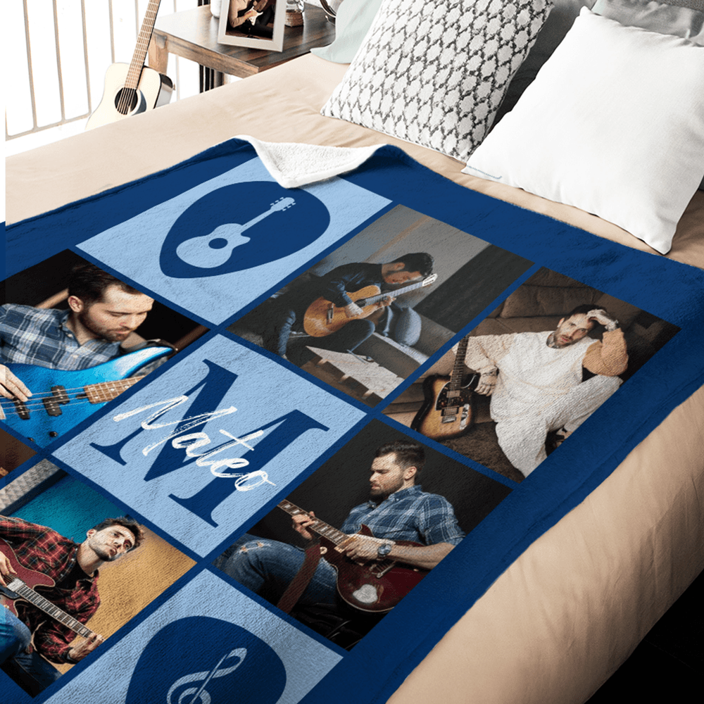 Diese Fotocollage-Decke verbindet Musik mit Erinnerungen und zeigt stilvolle Silhouetten von Gitarrenplektren, Musiknoten oder Gitarren, gepaart mit persönlichen Fotos Ihrer Wahl. Sie kann auch mit einem Namen oder Initialen versehen werden und ist in verschiedenen Farben erhältlich, die zu Ihrem Stil und Ihrem Raum passen, um eine wirklich einzigartige Hommage an Musik und Momente zu schaffen.