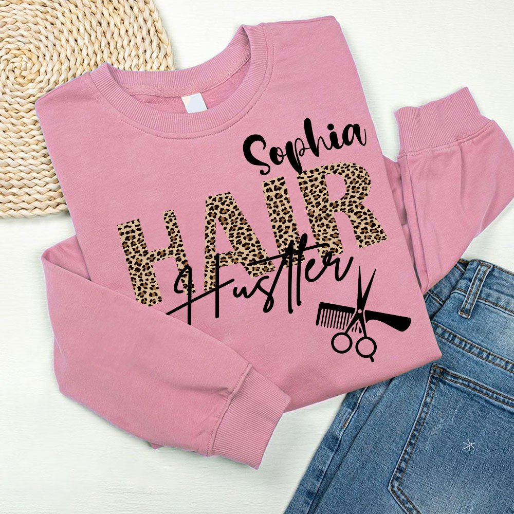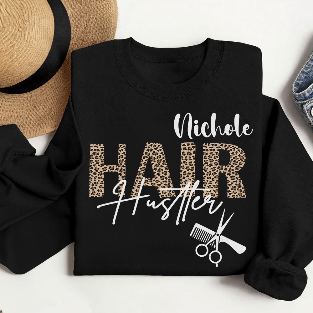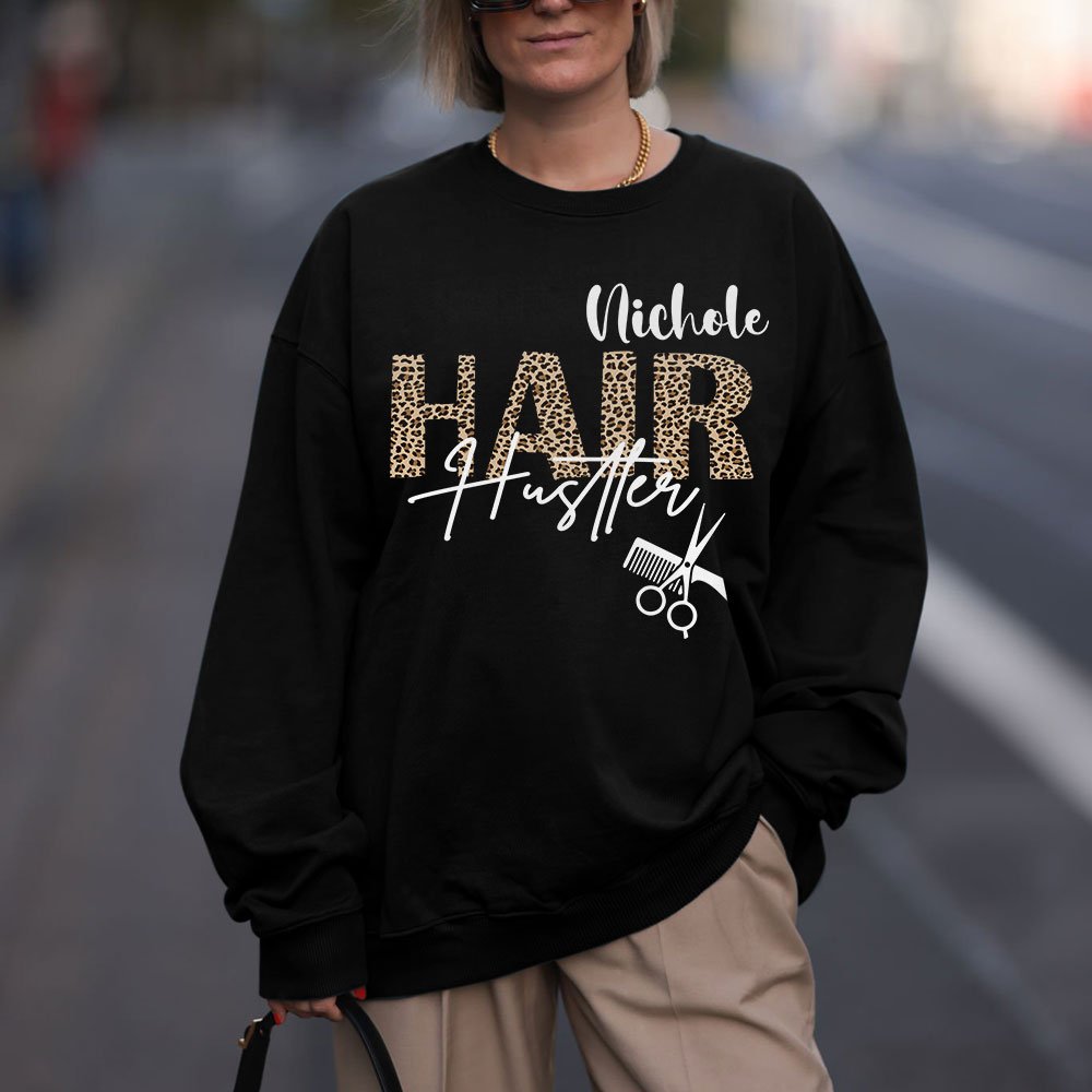 Dieses Sweatshirt und T-Shirt von Hair Hustler mit seinem auffälligen Leopardenprint zelebriert die Kunstfertigkeit und Leidenschaft von Friseuren und Friseurinnen. Das zusätzliche Scherensymbol und der individuelle Name verstärken die Verbindung zur Haarindustrie und ermöglichen es dem Träger, seine Identität und sein Fachwissen mit Stolz zu präsentieren.