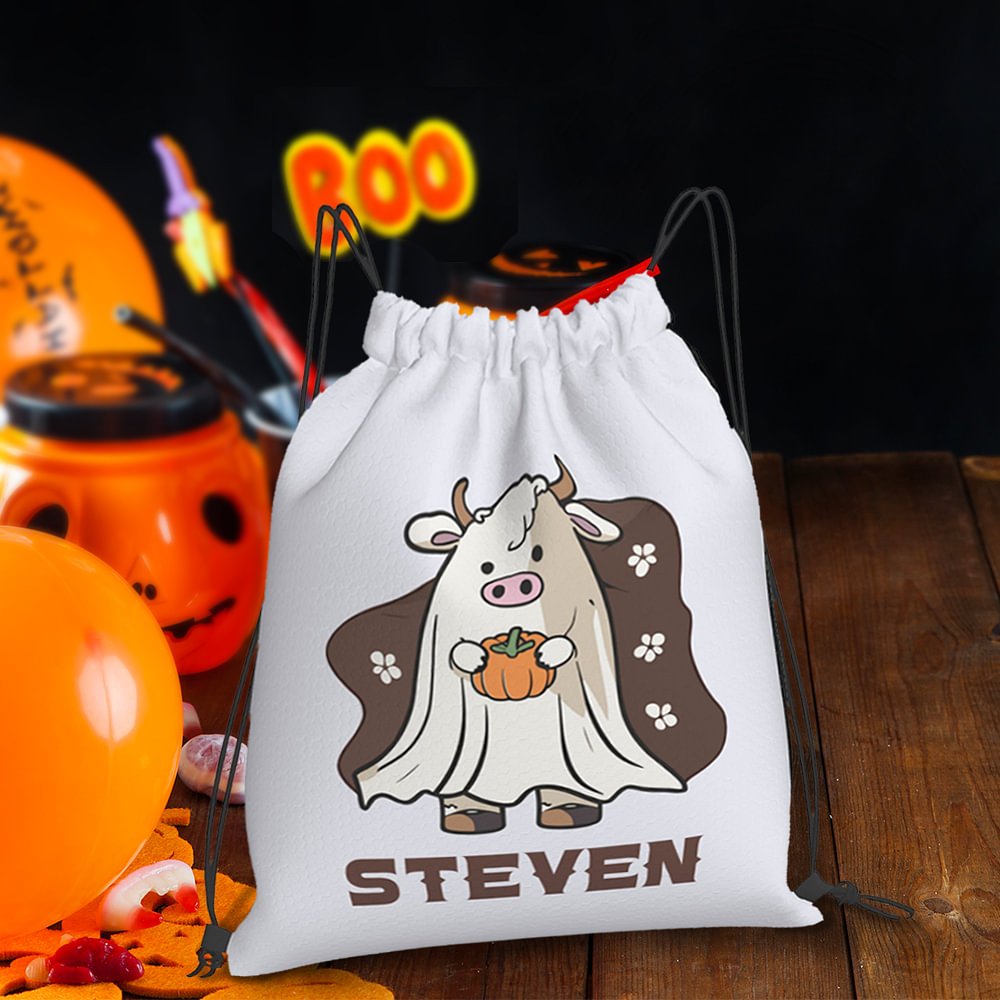 Niedliche Geisterkuh und Kürbiselemente auf der Umhängetasche mit Kordelzug. Die Kinder können ihre Lieblingsschriftart wählen und sie mit ihren Namen versehen, um ein einzigartiges und herzliches Geschenk zu kreieren, mit dem sie Süßes oder Saures genießen können.