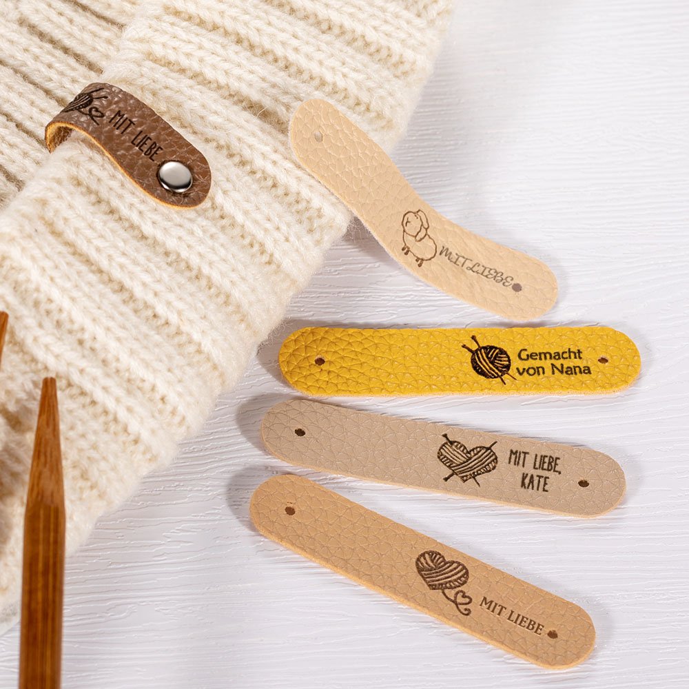 Diese aus hochwertigem PU-Leder gefertigten Etiketten sind langlebig. Sie fühlen sich luxuriös an, sind langlebig und werten das Gesamtbild Ihres Gegenstandes auf. Jedes Etikett wird sorgfältig genäht und mit Ihrem persönlichen Text geprägt, um eine klare und deutliche Erscheinung zu gewährleisten. Die natürliche Narbung des Leders verleiht Ihrem Kunsthandwerk ein schönes, zeitloses Element und macht es zu einem echten Unikat.
