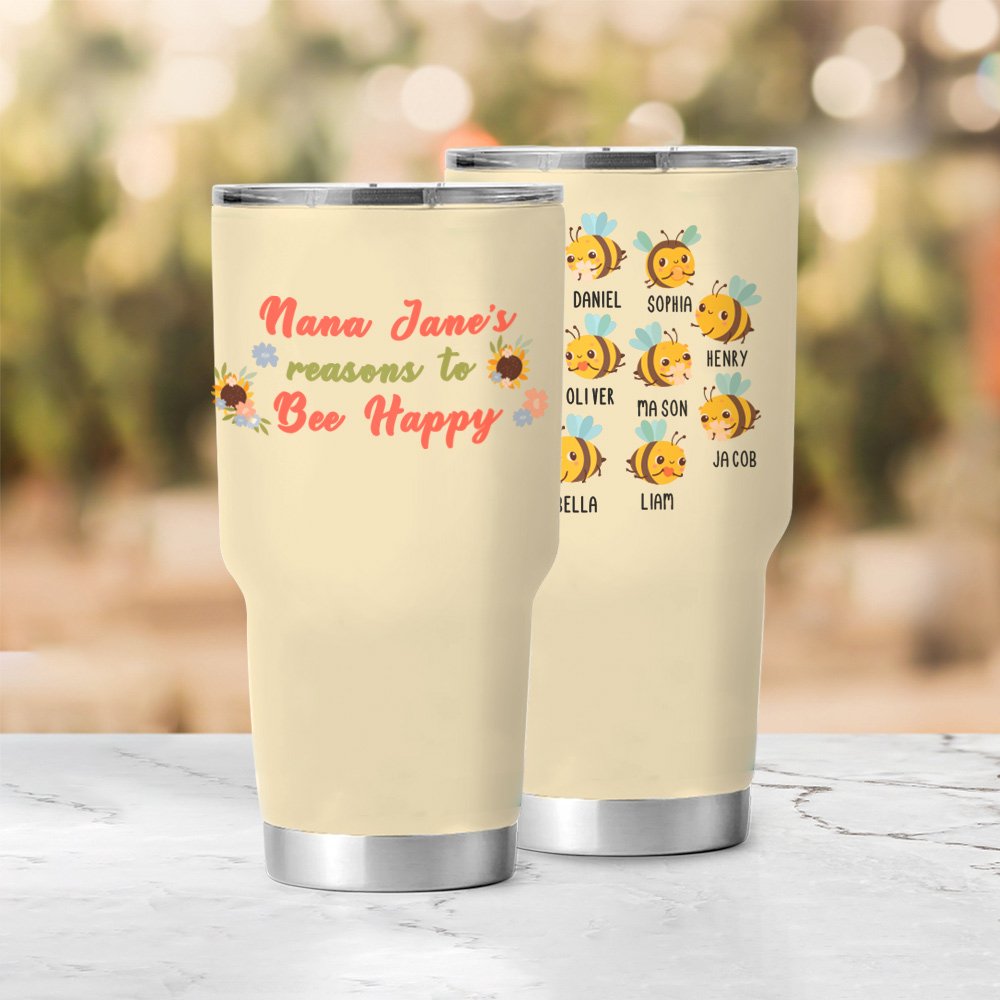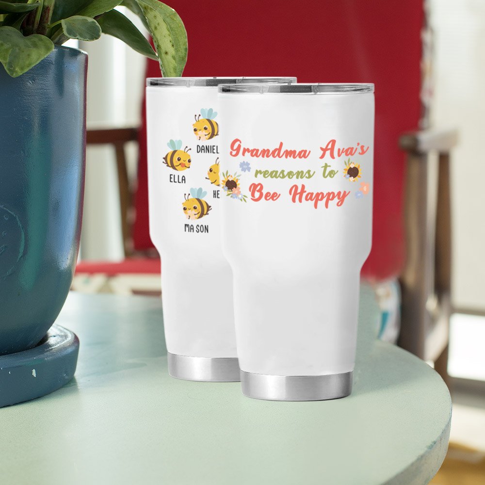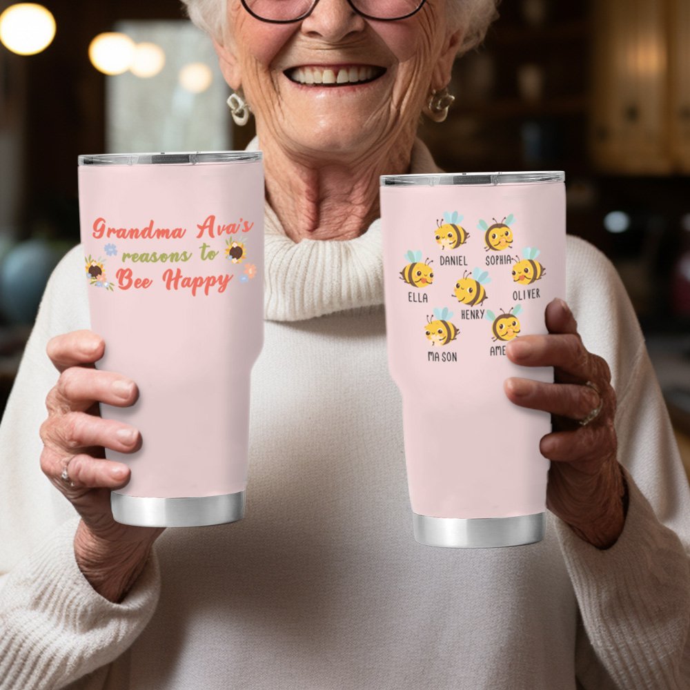 Der Becher wird mit einem individuellen Text und 2 - 10 niedlichen kleinen Bienen mit Namen personalisiert, die jeweils ein Kind repräsentieren und Mama wegen ihrer Größe, Selbstlosigkeit und ihres Duftes umgeben. Die Kinder können Mama glücklich machen, indem sie an ihrer Seite sind und ihre Liebe zu ihr ausdrücken.