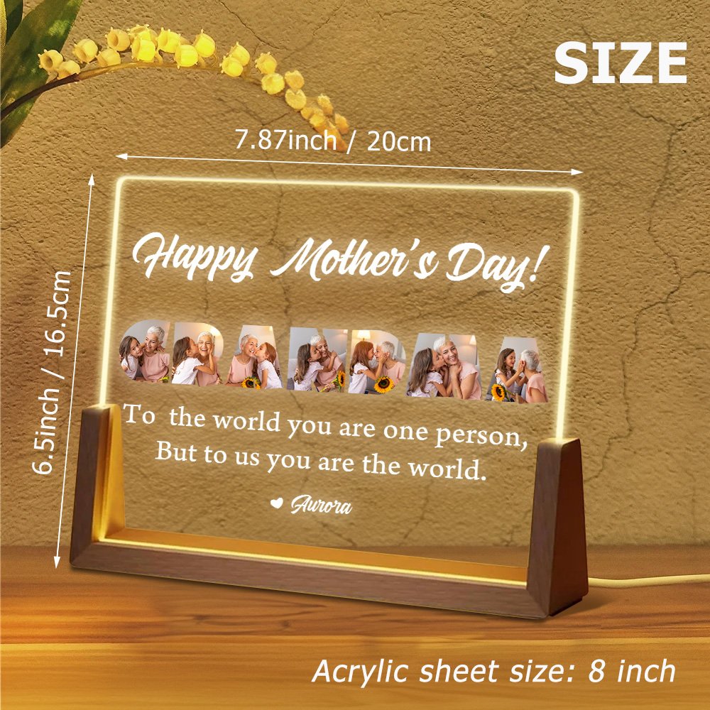 Dieses LED-Nachtlicht aus Acryl kann mit der Fotocollage der Spitznamen "Mom", "Mama" oder "Grandma" personalisiert werden, und fügen Sie die Namen von 1-12 Kindern für ein wirklich einzigartiges Geschenk. Die personalisierte Anpassung macht dieses Nachtlicht ein herzliches Andenken.