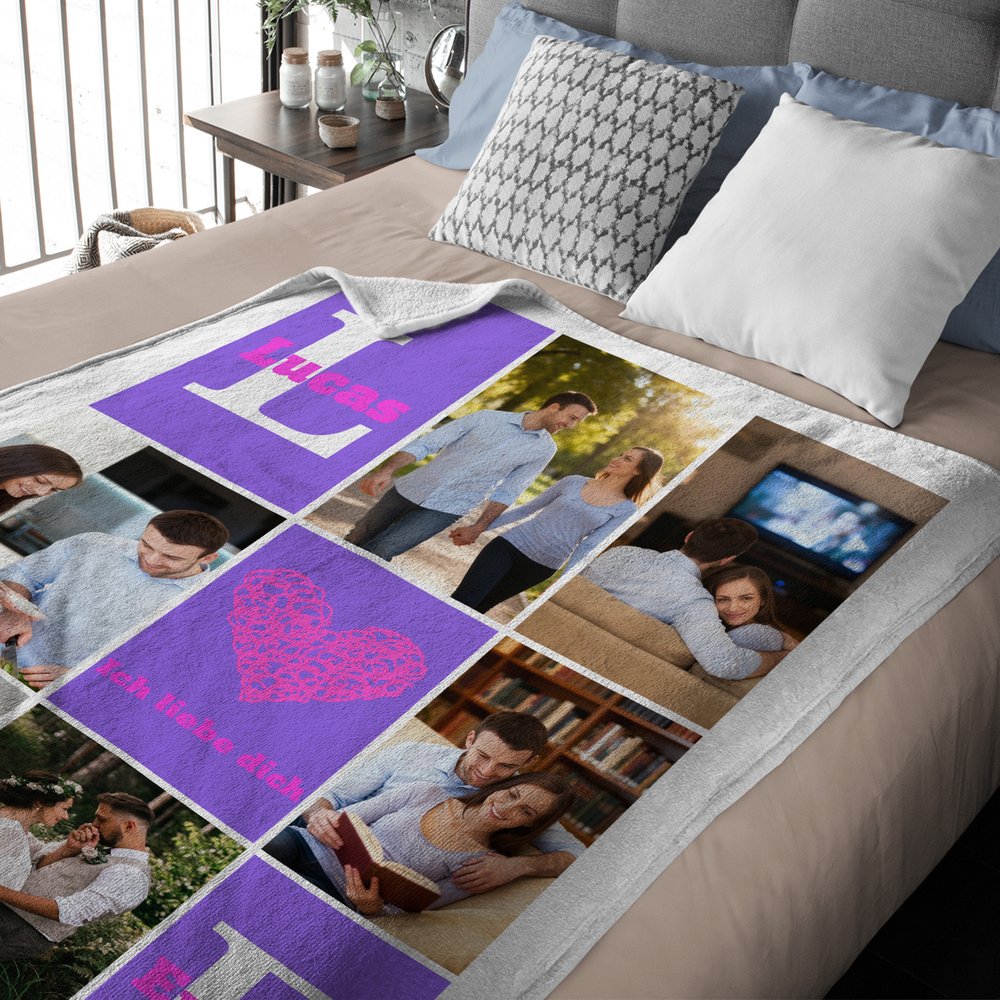 Dieses Design mit sechs Fotos in der Mitte bietet Ihnen zwölf verschiedene Optionen für Hintergrundfarben, Initialen, individuelle Daten und Herzmotive – ideal für ganz persönliche Gestaltungen. Lebendige, lichtechte Farben halten Ihre besonderen Momente fest – sei es Zuneigungsbekundungen, Reiseerinnerungen oder Hochzeitshöhepunkte – und bewahren sie auf einer Decke, die zu einem einzigartigen emotionalen Andenken wird.
