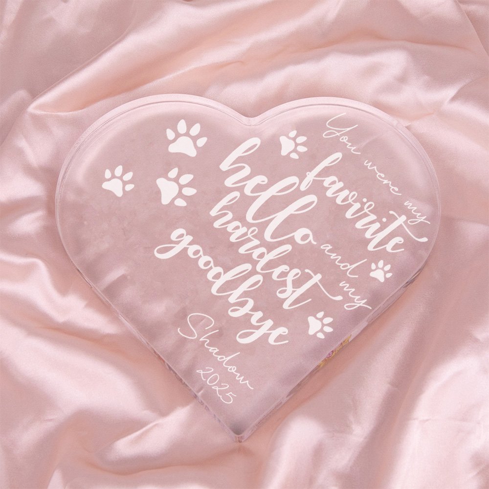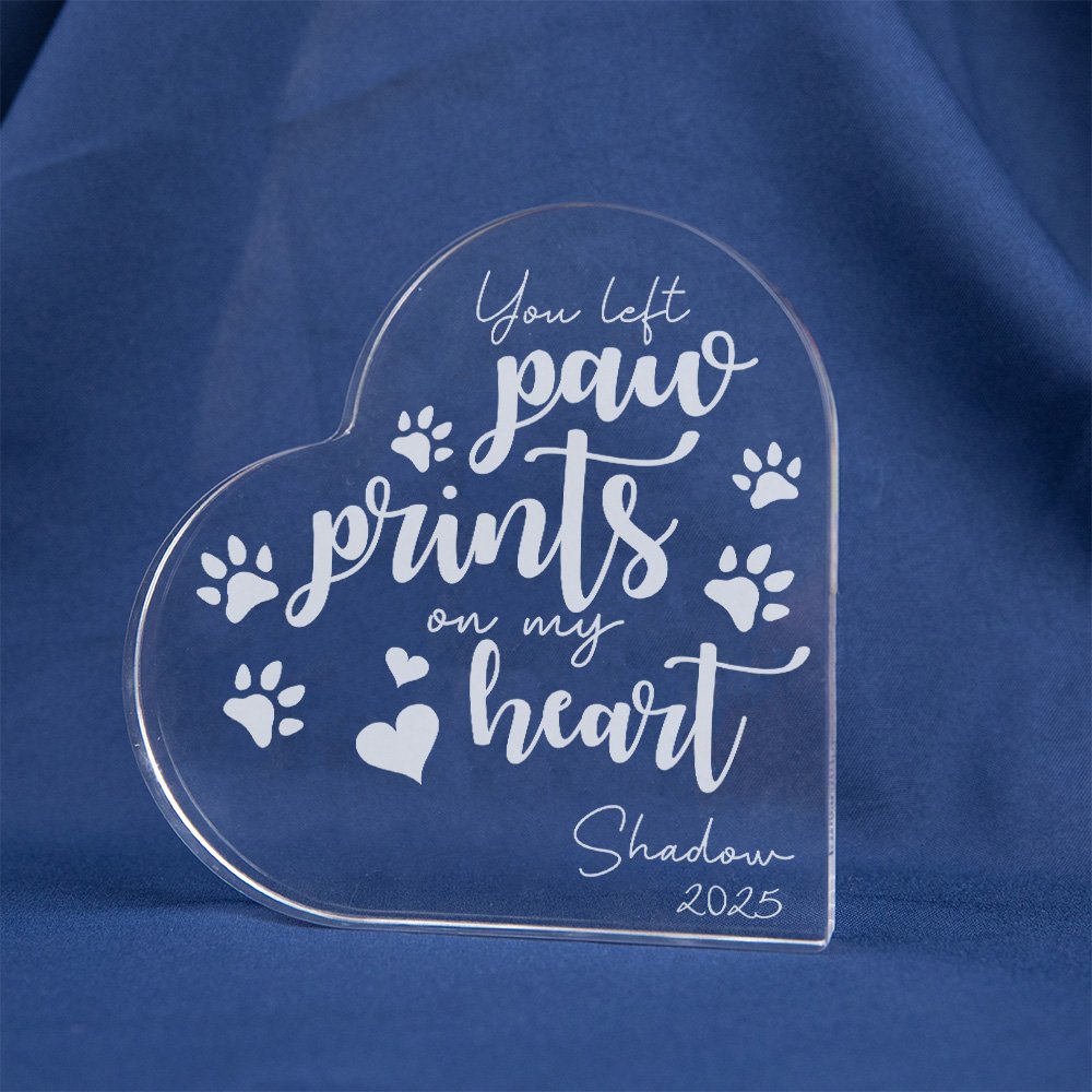 Die personalisierte Gedenktafel für Haustiere aus Acryl mit Herz ist eine bewegende Hommage an unsere verstorbenen pelzigen Freunde, die den Trauernden Trost spendet. Sie vermittelt eine tröstliche Botschaft, die das Glück, das Haustiere in unserem Leben vermitteln, und die immerwährenden Eindrücke ihrer Kameradschaft würdigt.