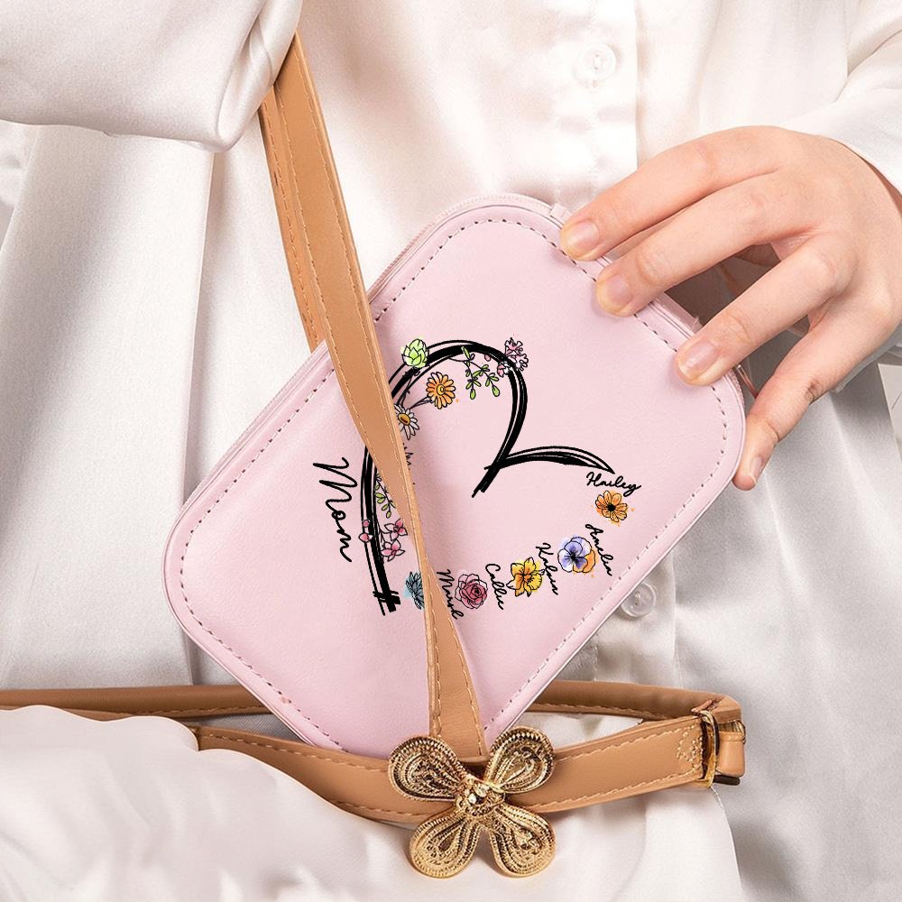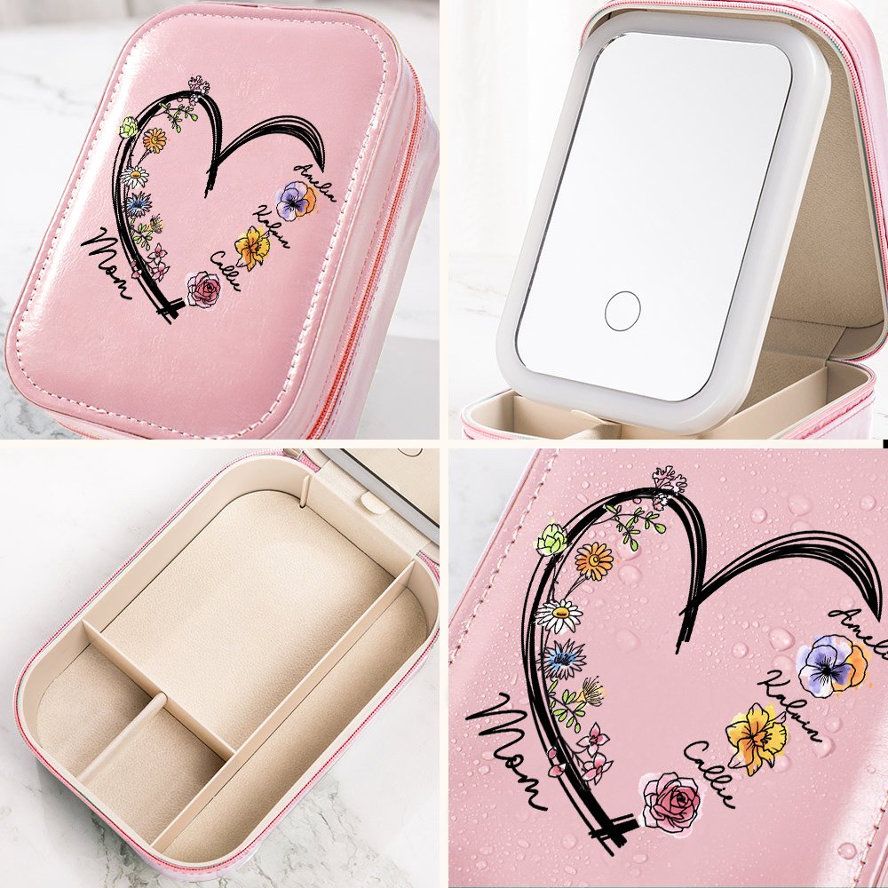 Dieses Schmuckkästchen verfügt über eine einfache Linie herzförmigen Design mit Aquarell Geburtstag Blumen um den Umriss gewickelt, können Sie 1-6 Geburtstag Blumen und Namen anpassen, und fügen Sie einen Titel, um eine warme und fröhliche Atmosphäre zu schaffen.