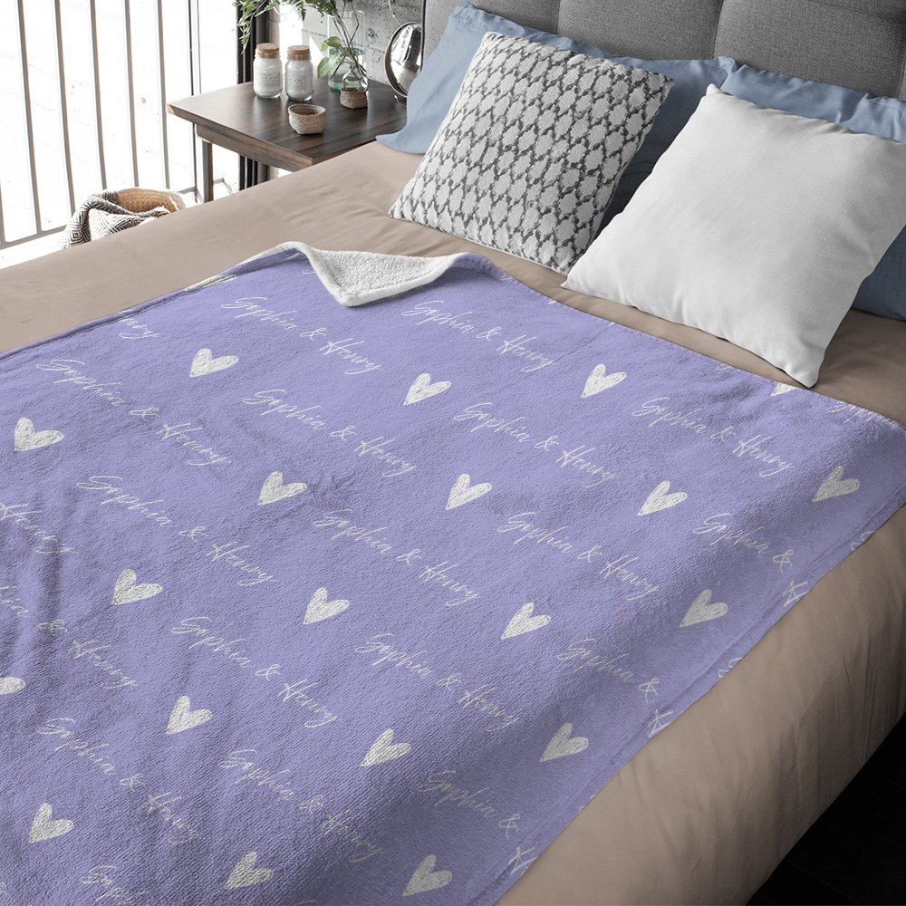 Die Decke hat ein bezauberndes Design mit herzförmigen Mustern, die Liebe und Verbundenheit symbolisieren. Mit der Option, sie mit Ihren Namen oder Initialen zu versehen, wird sie zu einem wirklich einzigartigen Stück, das Ihre Beziehung feiert. Diese Decke ist nicht nur ein kuscheliges Accessoire, sondern auch ein herzliches Symbol der Hingabe.