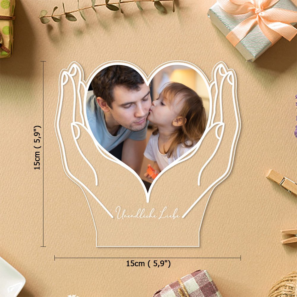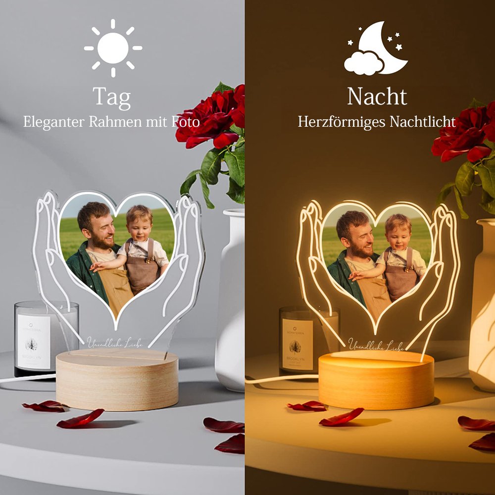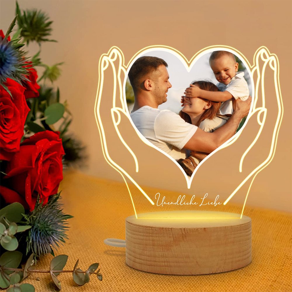 Dieses Nachtlicht zeigt auf elegante Weise ein Paar Hände, die ein Herz halten, in dem ein persönliches Foto mit wertvollen Erinnerungen zu sehen ist. Ein warmer und herzlicher Text kann auch an der Unterseite angepasst werden, so dass dies ein unverwechselbares und unvergessliches Geschenk ist.