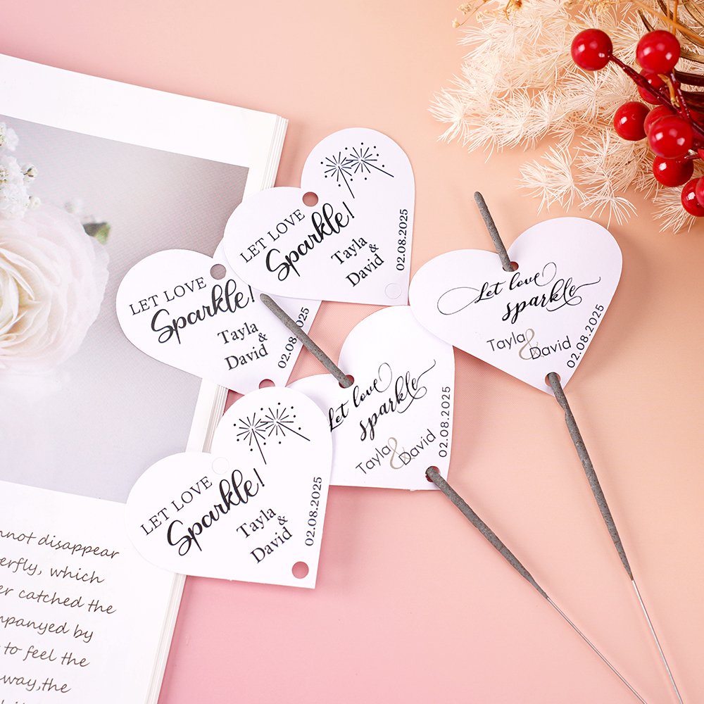 Unsere Wunderkerzen-Anhänger aus hochwertigem Karton sind dick, haltbar und sehr strukturiert. Sie sind mit hochwertigen Farben bedruckt, die weder verblassen noch verschmieren, sodass Ihre besondere Botschaft während der gesamten Feier hell erstrahlt. Jedes Etikett ist präzise geschnitten und so gestaltet, dass es den Belastungen während der Veranstaltung standhält und eine zuverlässige Ergänzung Ihrer Hochzeitsdekoration darstellt.