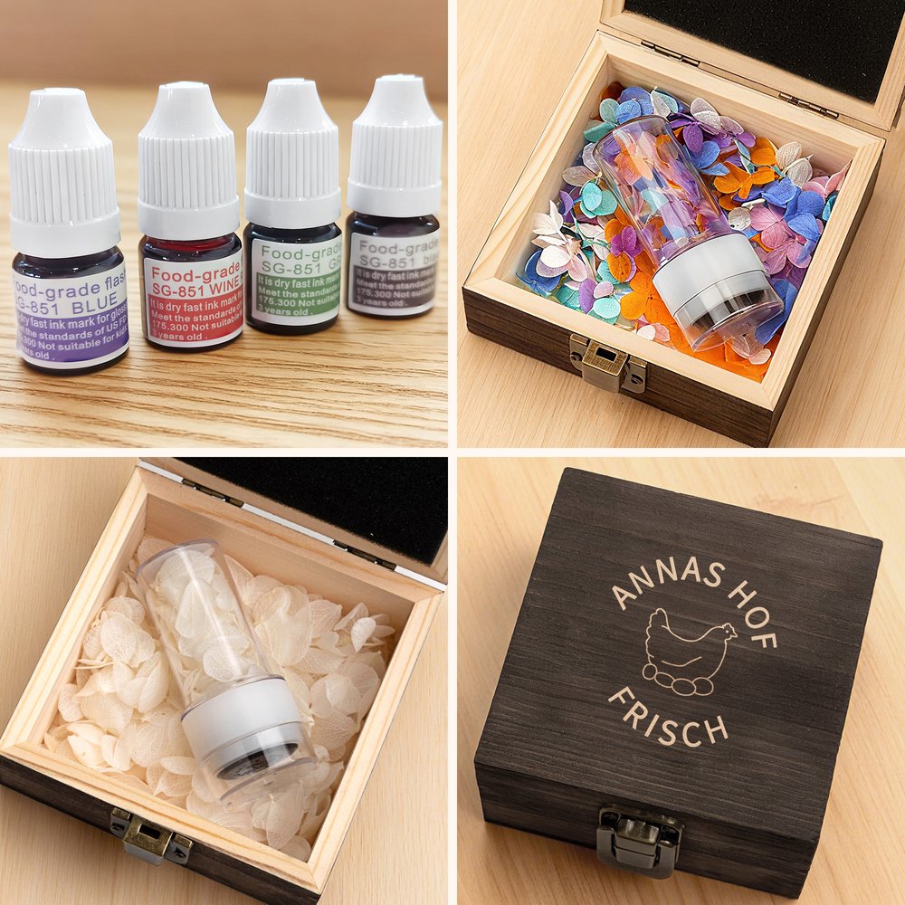 Die Stempel bestehen aus leichtem, bruchsicherem und langlebigem Kunststoff, der formstabil und widerstandsfähig gegen Verformung ist. Die mitgelieferte Box aus Paulownia-Holz bietet einen idealen Aufbewahrungsort für den Stempel. Die verwendete lebensmittelechte Tinte entspricht den FDA-Standards und sorgt für klare, ungiftige und unbedenkliche Abdrücke. Sie ist für den direkten Kontakt mit Eiern und Eierkartons geeignet und sowohl für Erwachsene als auch für Kinder sicher.
