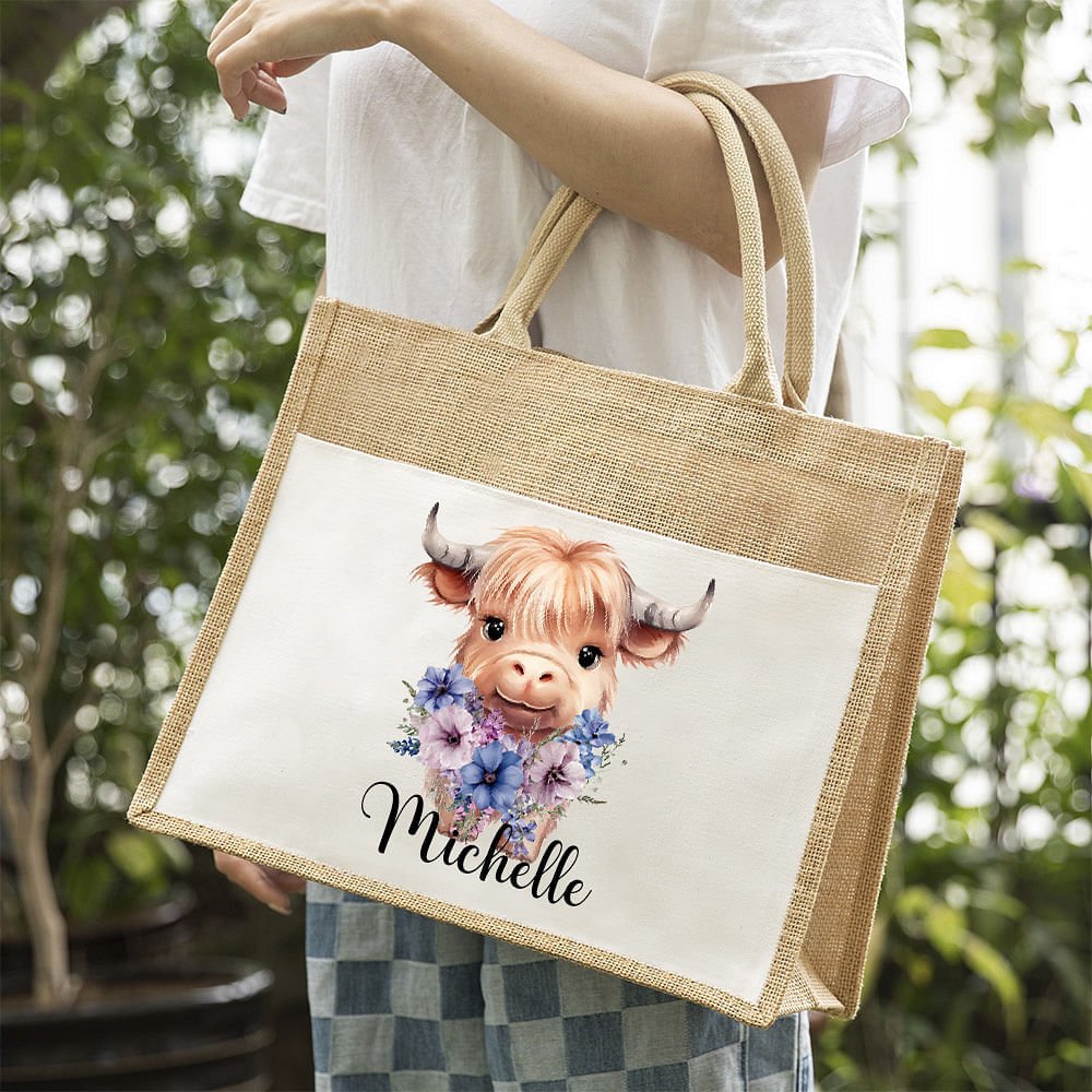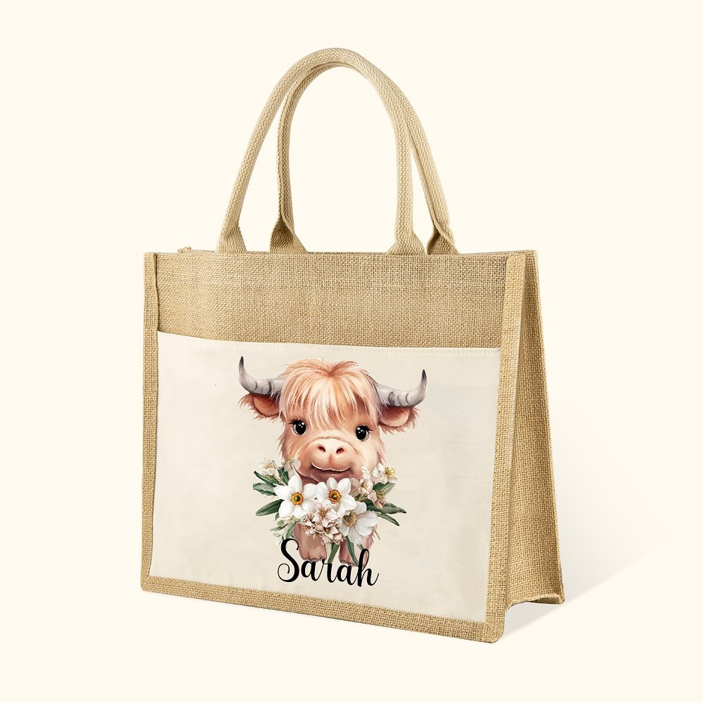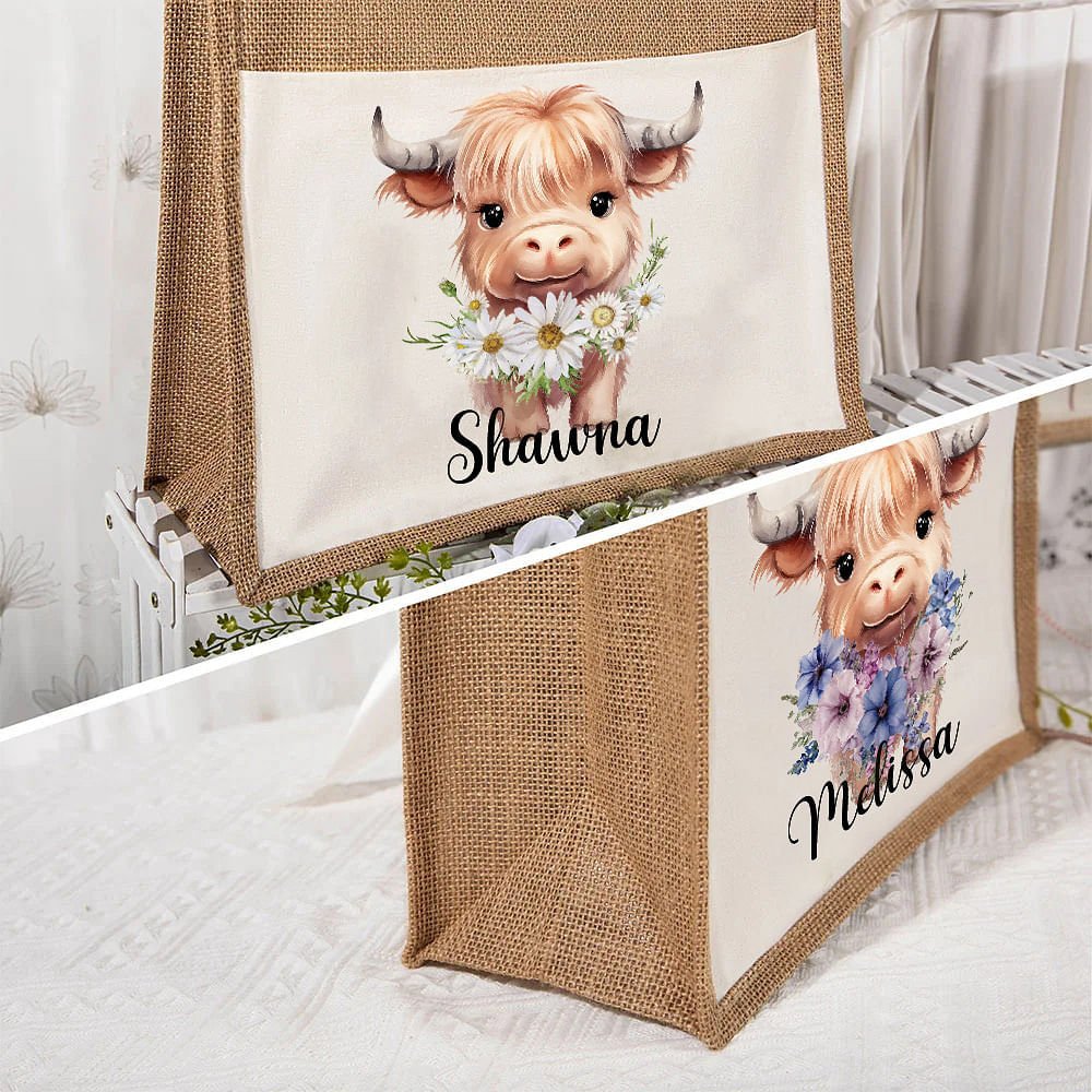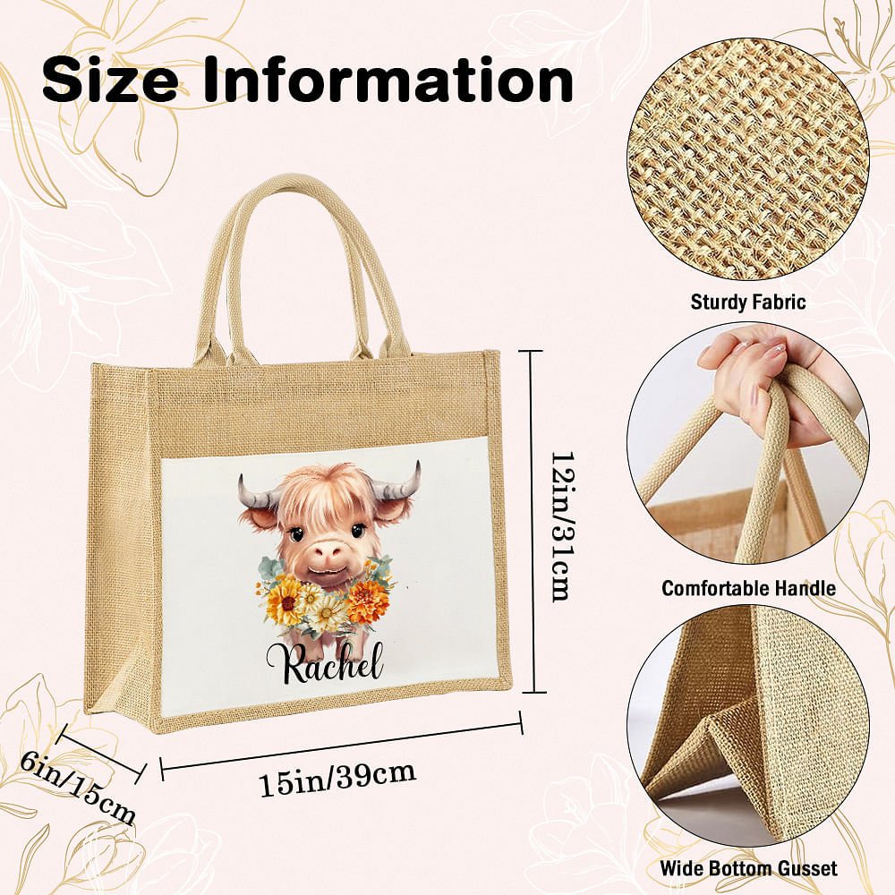 Das Design ist inspiriert von der Suche nach der Schönheit der Natur. Durch die Kombination der Geburtstagsblumen der verschiedenen Monate mit Hochlandkuh, lebendige und lebendige Kälber kommen in Sicht. Der Name kann auf der Vorderseite angepasst werden, um Ihre Tasche persönlicher zu gestalten.