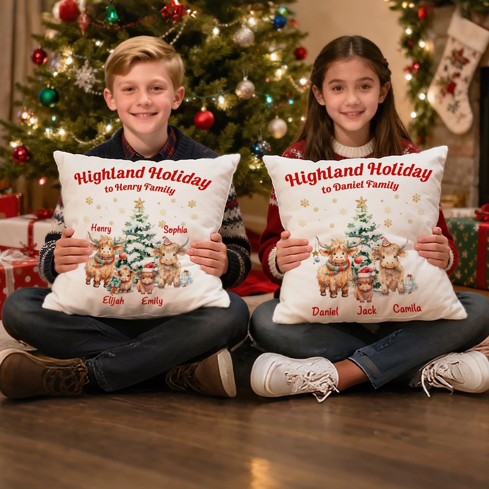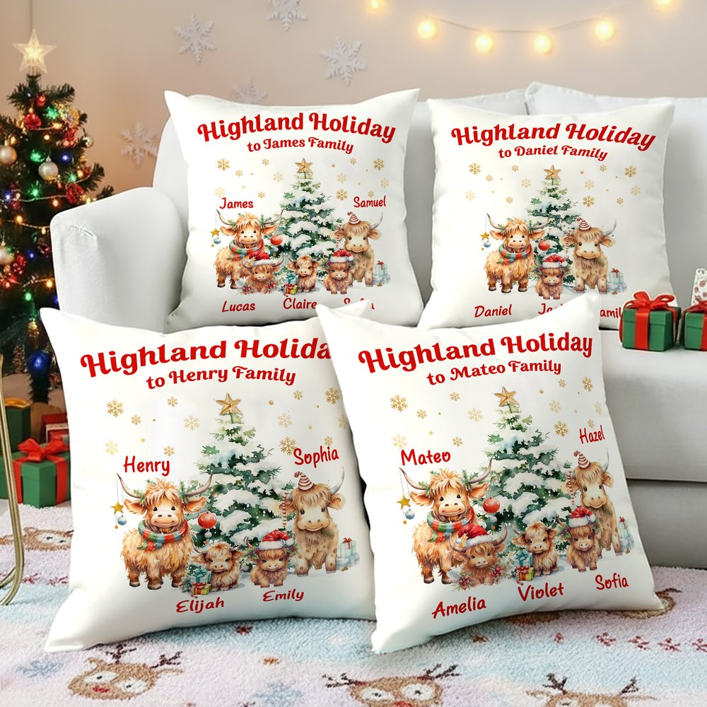 Dieser Kissenbezug zeigt ein niedliches Hochlandkuh-Familienmuster als zentrales Motiv, das durch klassische Weihnachtselemente wie Weihnachtsbäume und Schneeflocken ergänzt wird, um eine reiche, festliche Atmosphäre zu schaffen. Sie können auch den Nachnamen der Familie und die Namen der Mitglieder auf dem Kissenbezug individuell gestalten und so Ihrem Raum mühelos einen einzigartigen weihnachtlichen Touch verleihen und eine einzigartige, warme Weihnachtsdekoration schaffen.