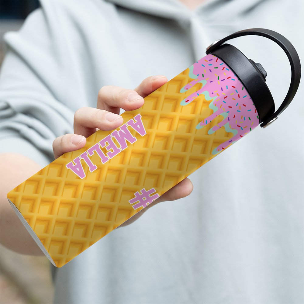Der Becherkörper dieser Wasserflasche nimmt Waffel- und Eiscreme-Tropfmuster an, die bunt und voller kindlichem Spaß sind. Kombiniert mit der Silhouette des Sportlers, der den Baseball oder Softball schlägt, und dem anpassbaren Namen und der Nummer, erhöht es seine Exklusivität und macht es zu einem Erinnerungs-Modeartikel.