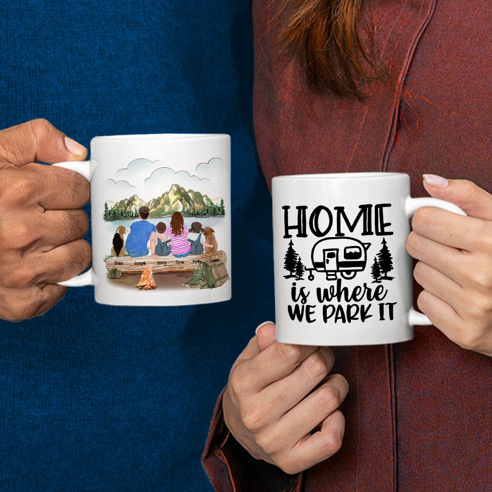 Die Tassen sind mit den Worten "Home Is Where We Park It" und einem herzerwärmenden Bild der Familie in der freien Natur bedruckt. Du kannst eine einzigartige Tasse erhalten, indem du das Outfit der Figur und die Rasse deines pelzigen Freundes anpasst.