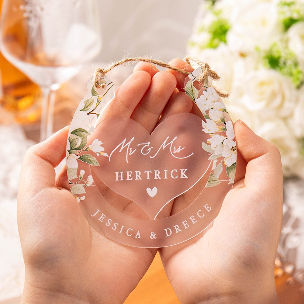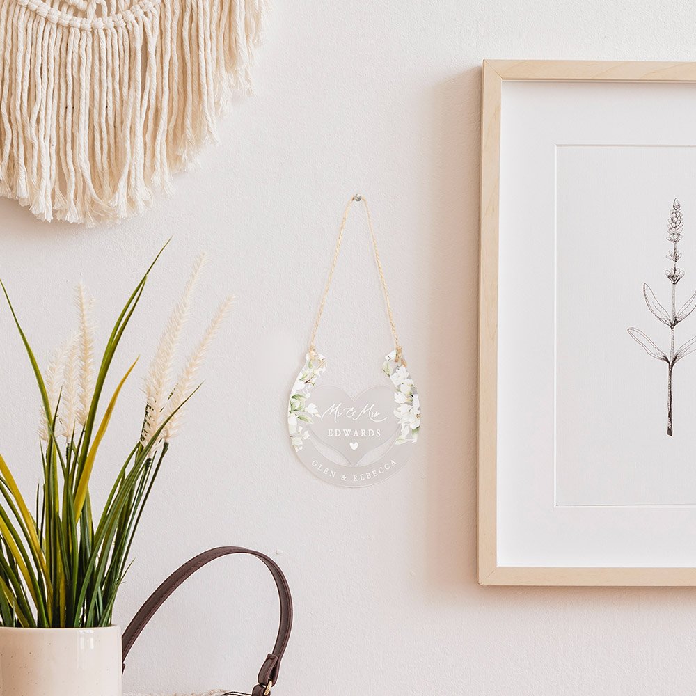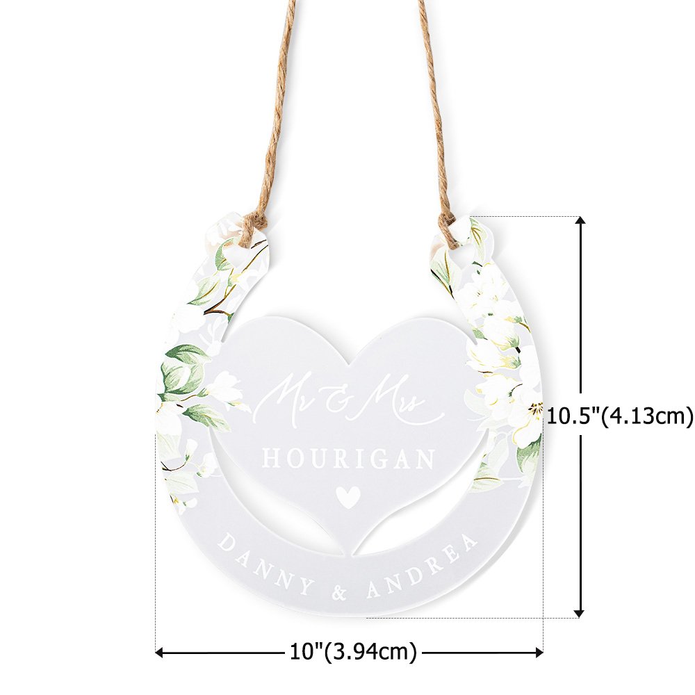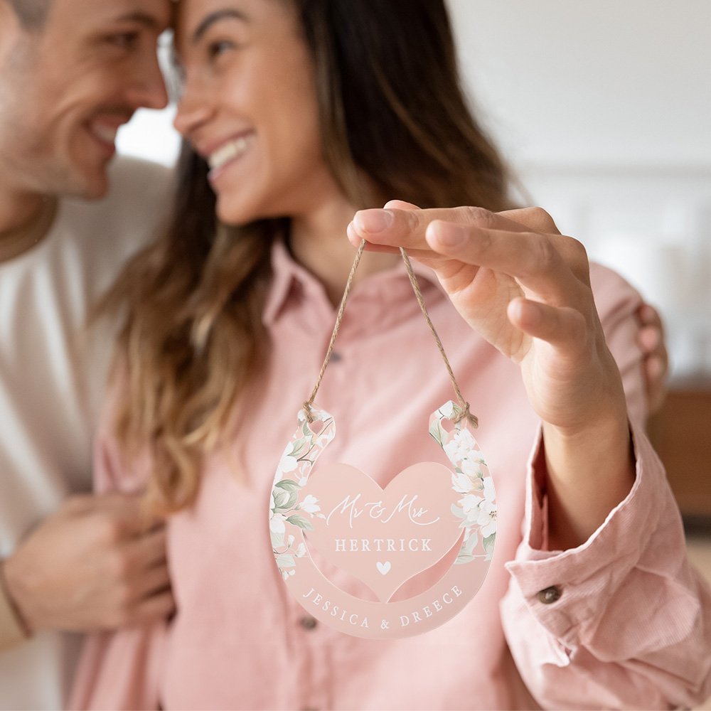 Der äußere Ring dieses wunderschönen hufeisenförmigen Hängeornaments zeigt ein mit Blumen verziertes Hufeisenmuster, das eine warme Atmosphäre schafft. Der innere Ring hat die elegante Form eines Herzens und ermöglicht die individuelle Gestaltung von Nachnamen und Paarnamen. Jede Dekoration wird mit einem Juteseil geliefert, das so zugeschnitten werden kann, dass es perfekt in jedes Aufhängeloch passt.