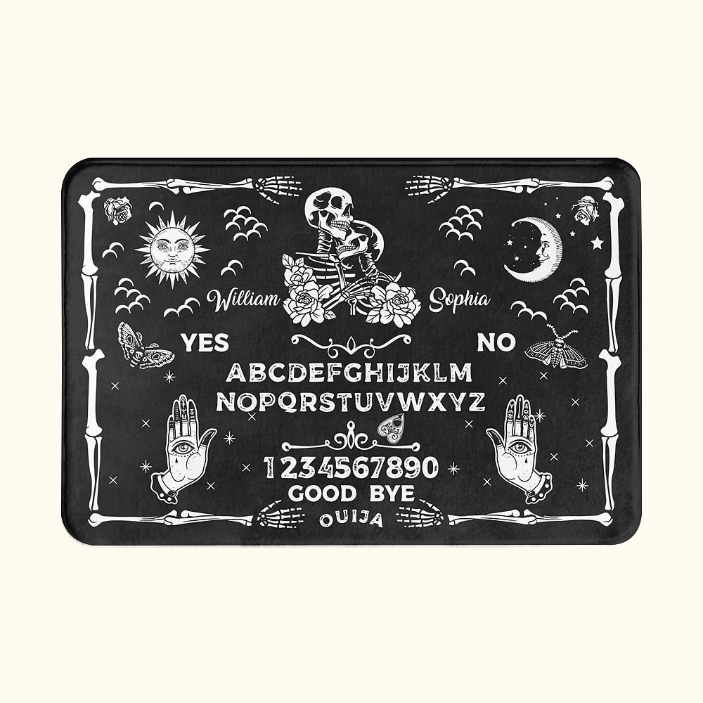 Diese Fußmatte zum Thema Ouija-Brett mit ihren einzigartigen Sonnen-, Mond- und Skelettmustern, kombiniert mit einem individuell gestaltbaren Namen im Gothic-Stil, zeigt außergewöhnliche Persönlichkeit und Geheimnis.