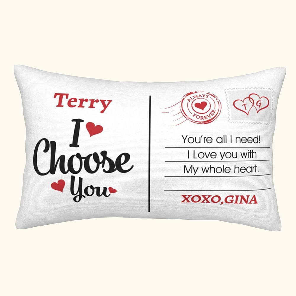 Umhüllen Sie sich und Ihren Liebsten mit Wärme und Zuneigung mit unserem "I Choose You" Liebesbrief-Kissen. Dieses Kissen verfügt über ein anpassbares Design, das es Ihnen ermöglicht, Namen und eine vierzeilige Nachricht aufzudrucken, was es zu einem einzigartigen und geschätzten Geschenk für jeden besonderen Anlass macht.