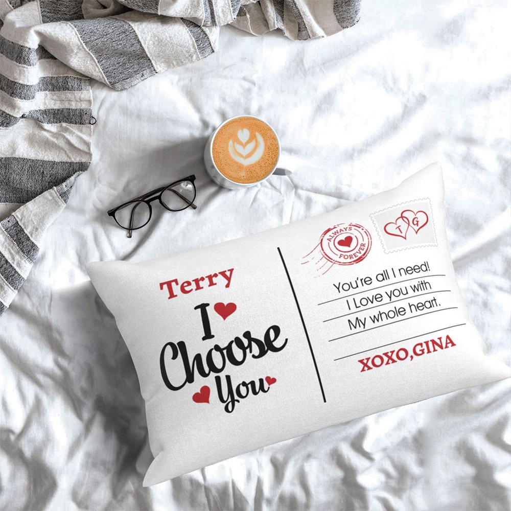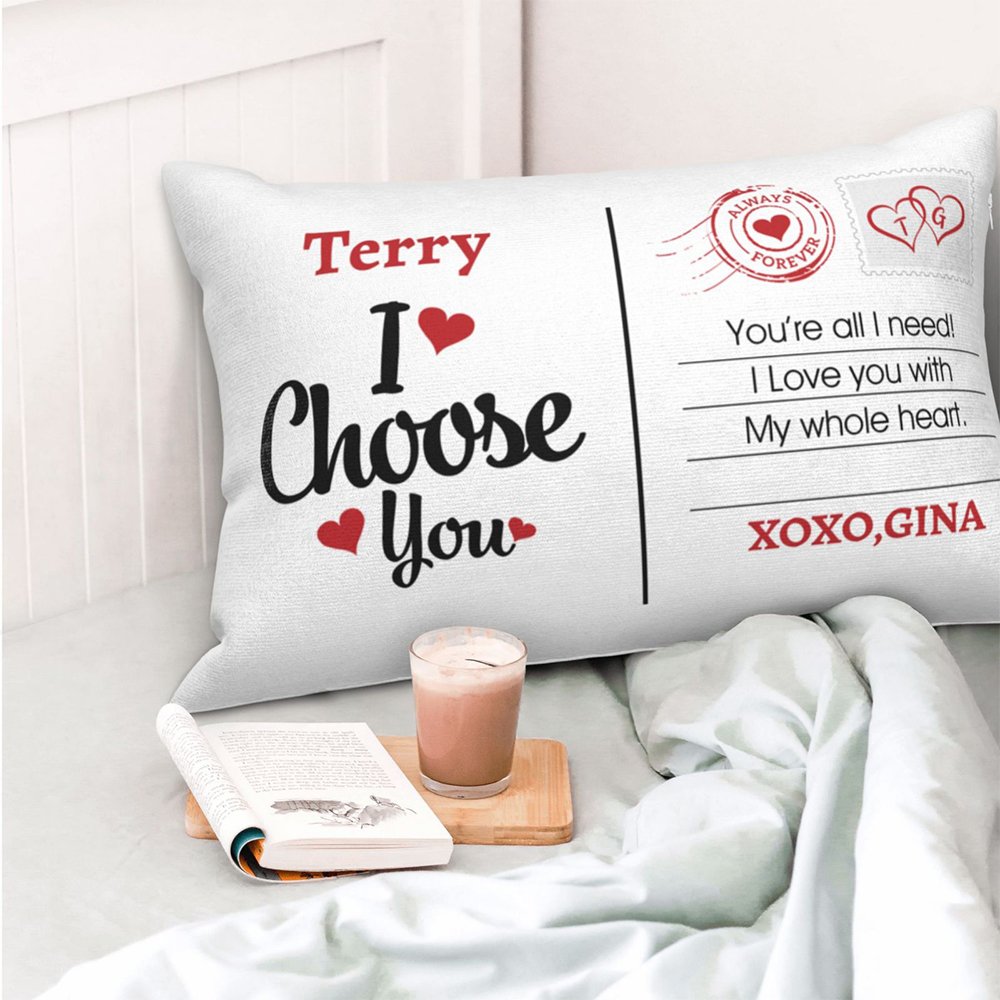 Umhüllen Sie sich und Ihren Liebsten mit Wärme und Zuneigung mit unserem "I Choose You" Liebesbrief-Kissen. Dieses Kissen verfügt über ein anpassbares Design, das es Ihnen ermöglicht, Namen und eine vierzeilige Nachricht aufzudrucken, was es zu einem einzigartigen und geschätzten Geschenk für jeden besonderen Anlass macht.
