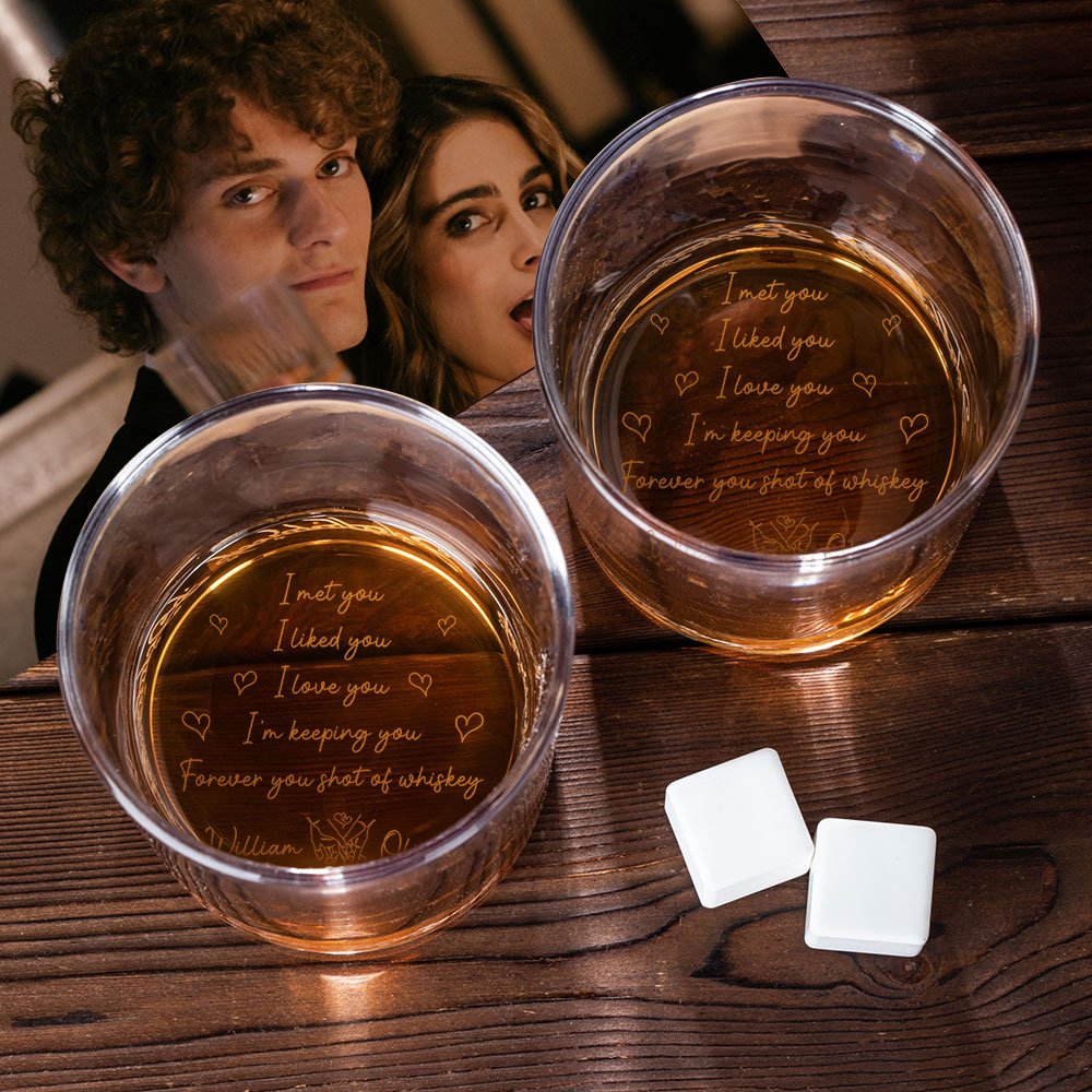 Das einzigartige Whiskeyglas ist mit einem festen Text versehen: "I met you, I like you, I love you, I'm keeping you, Forever you shot of whiskey". Das auffällige Hand-in-Hand-Design sorgt zusammen mit romantischen Sprüchen, personalisierten Namen und Herzverzierungen für einen verträumten und süßen Touch.