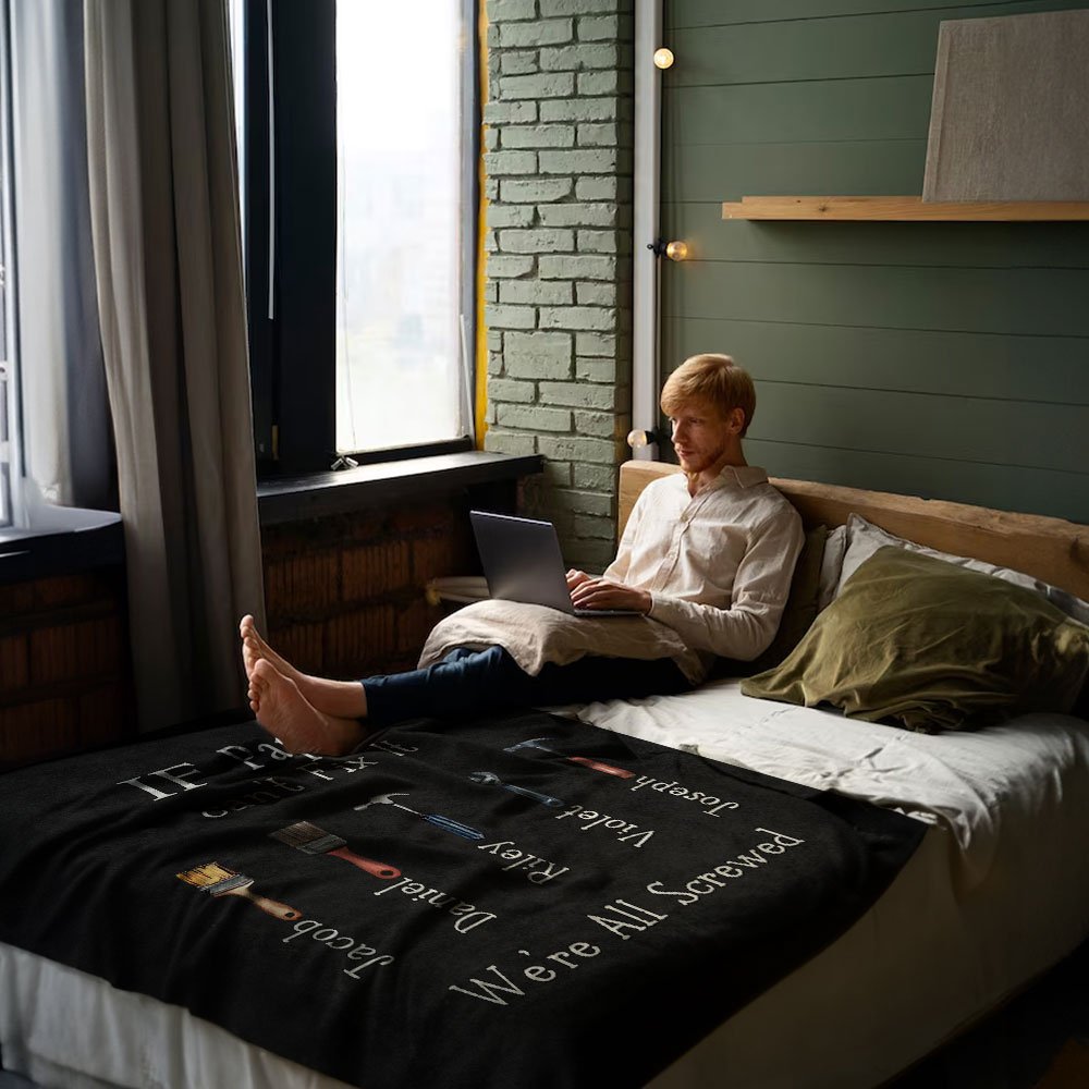Unsere Decke „IF Opa/Papa can't Fix It“ (Wenn Opa/Papa es nicht reparieren kann) verwendet Reparaturwerkzeuge und Muster, um jedes Familienmitglied im Haus darzustellen und eine spielerische Atmosphäre zu schaffen. Der herzerwärmende und humorvolle Text „IF Opa/Papa can't Fix It, We're All Screwed“ (Wenn Opa/Papa es nicht reparieren kann, sind wir alle am Arsch) ist eine herzliche Hommage an die besondere Verbindung zwischen Opa und seinen Kleinen.