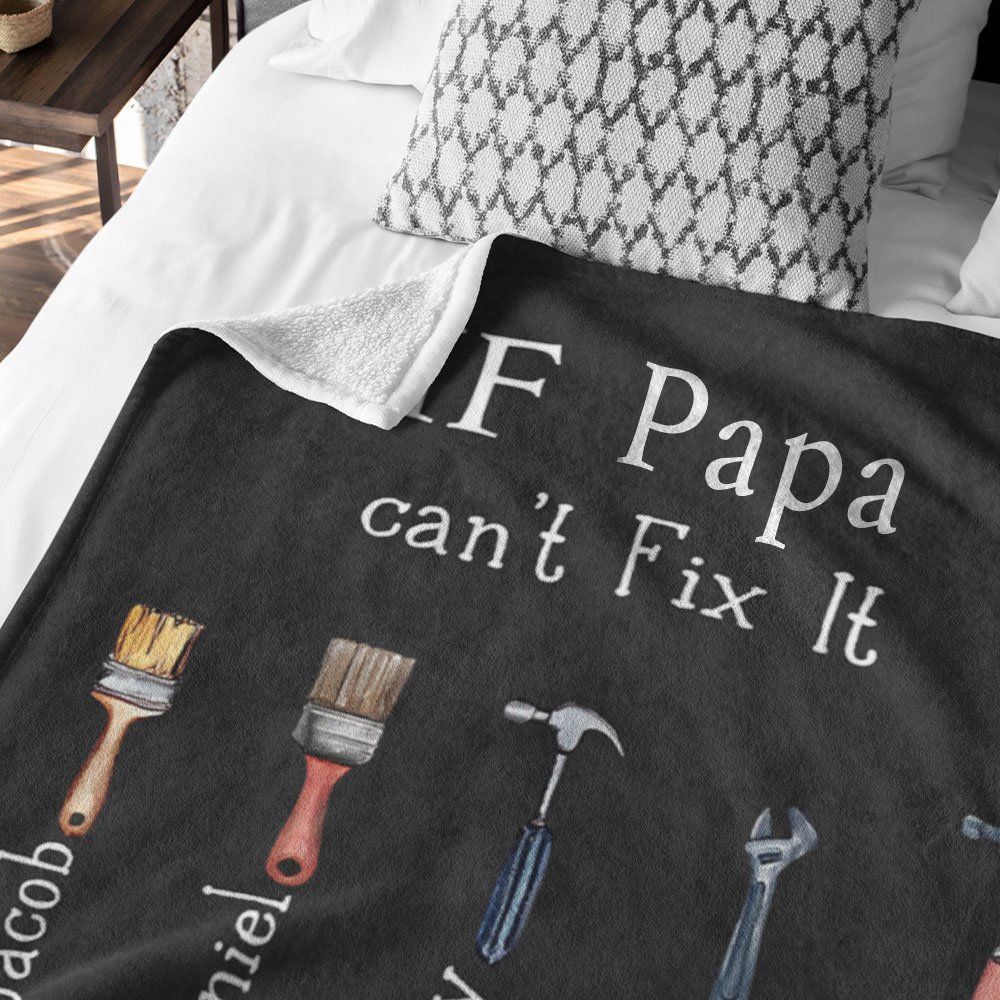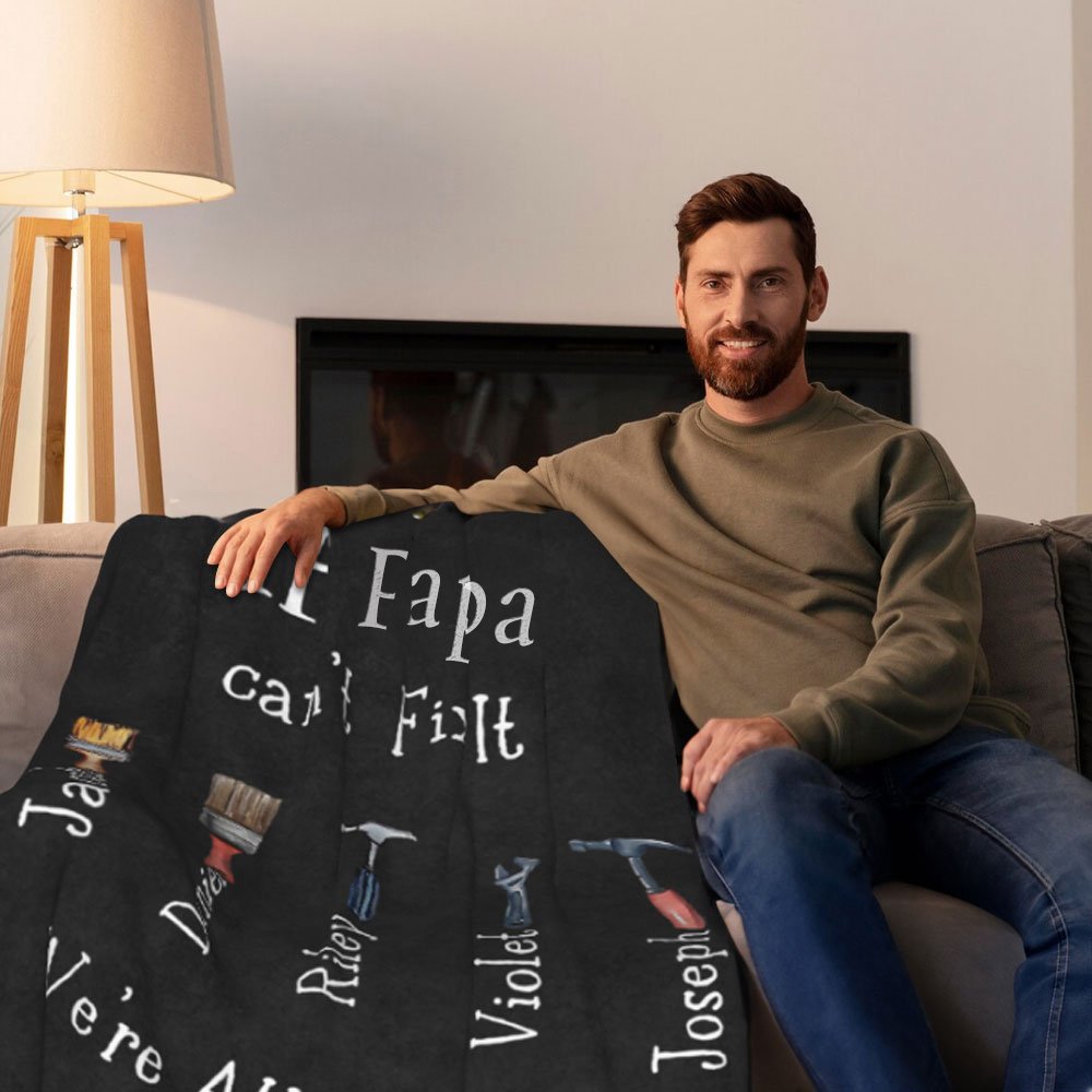Machen Sie diese Decke zu einem echten Unikat, indem Sie Reparaturwerkzeuge auswählen und den Namen Ihres Kindes hinzufügen. Das personalisierte Design verleiht der Decke eine besondere Note und zeigt Ihrem Vater oder Großvater, wie viel er Ihrem Kind bedeutet.