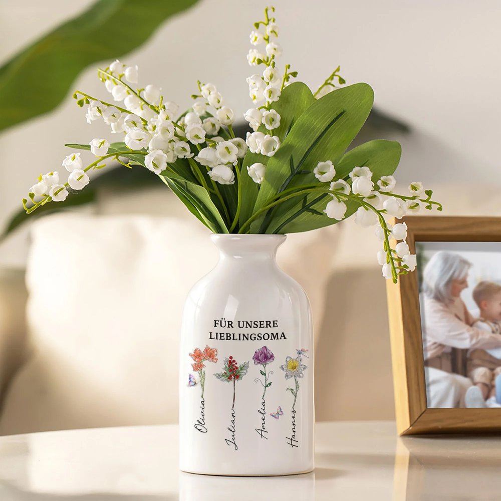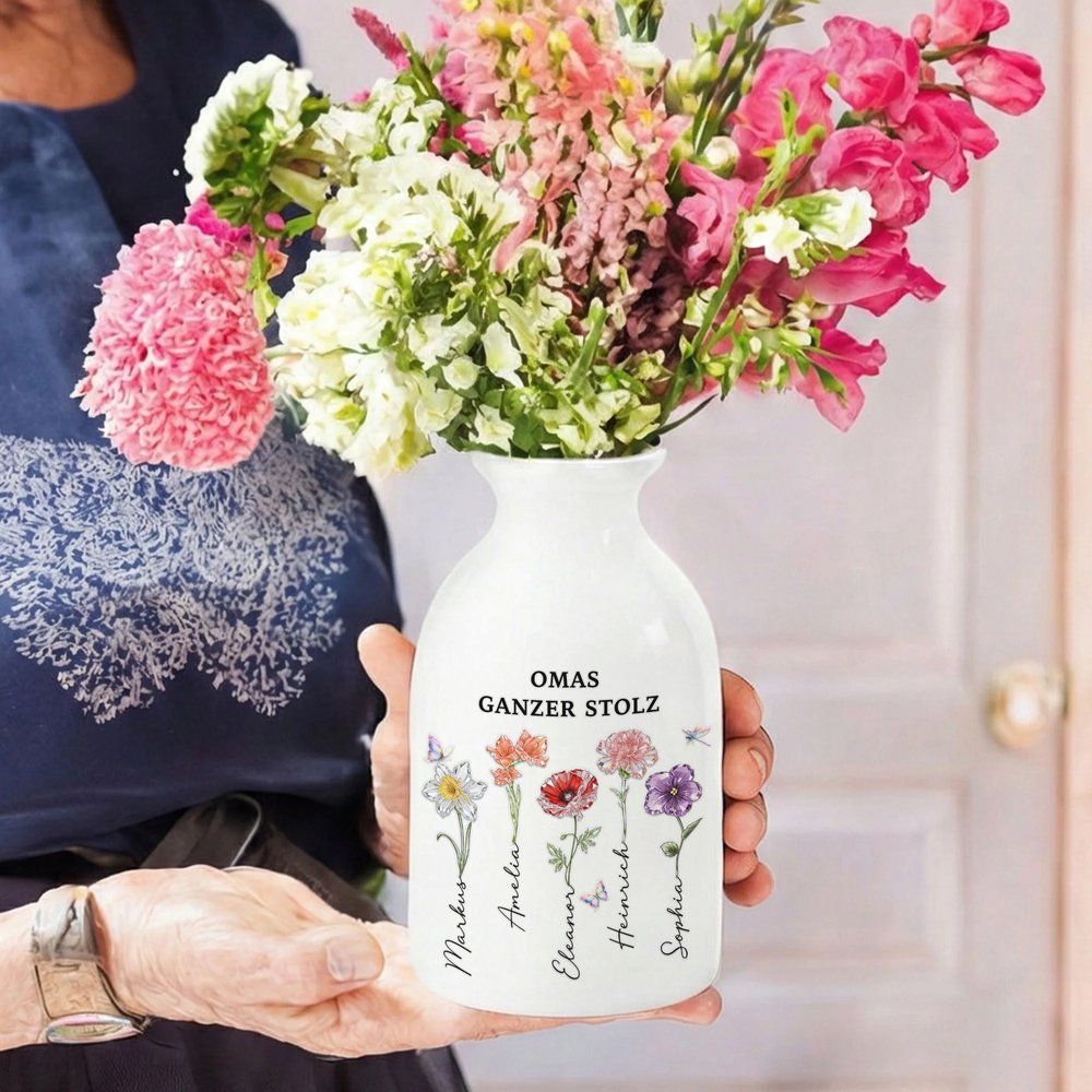Die Vase ist mit einem klaren Muster aus Geburtsblumen gestaltet und wird durch farbenfrohe Schmetterlingsakzente ergänzt, die im Licht besonders schön funkeln. Sie bietet Platz für individuelle Namen und persönliche Botschaften, wodurch das Design eine ganz besondere und wertvolle Bedeutung erhält. Der Keramikkörper und das Kristallmuster greifen stilvoll ineinander und verbinden die natürliche Schönheit der Blumen mit einer persönlichen Note.