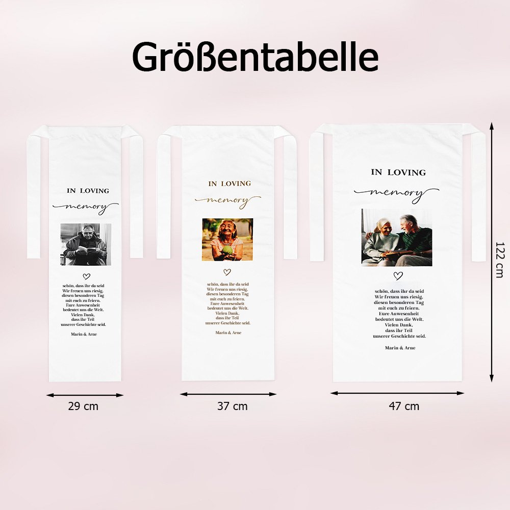 Dieser „In liebevoller Erinnerung“-Stuhlbanner für Ihre Hochzeit bietet eine einfühlsame Möglichkeit, einen geliebten Menschen bei einem der wichtigsten Momente im Leben zu ehren. Es kann individuell mit einem persönlichen Foto, Namen und einer herzlichen Botschaft gestaltet werden. So entsteht ein berührender Tribut, der die Liebe und gemeinsamen Erinnerungen auf besondere Weise zum Ausdruck bringt.