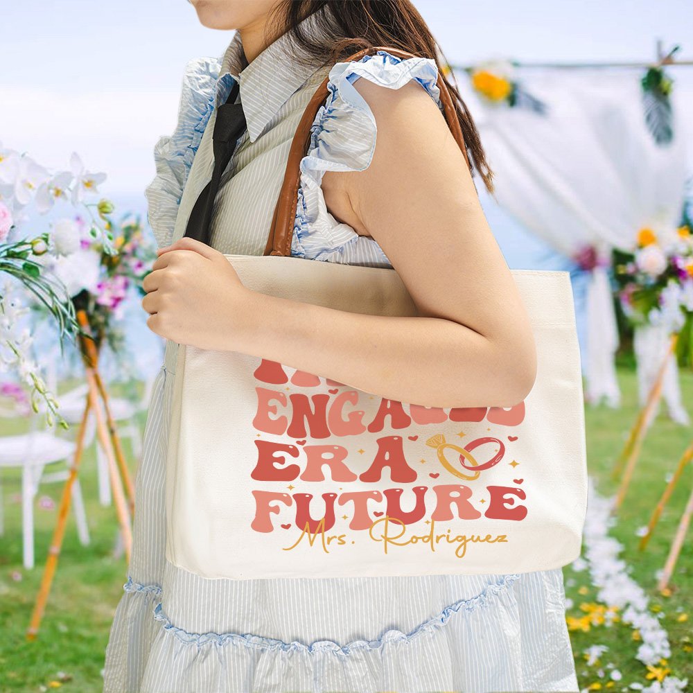 Die Tasche "IN MY ENGAGED ERA FUTURE" ist in sanften Farben wie Rot, Rosa und Gold gehalten. Herzsymbole und glitzernde Sterne unterstreichen die romantische und süße Atmosphäre. Die moderne und witzige handgeschriebene Schrift verleiht einen Hauch von Jugendlichkeit und Mode und passt perfekt zur fröhlichen Stimmung einer Verlobung.