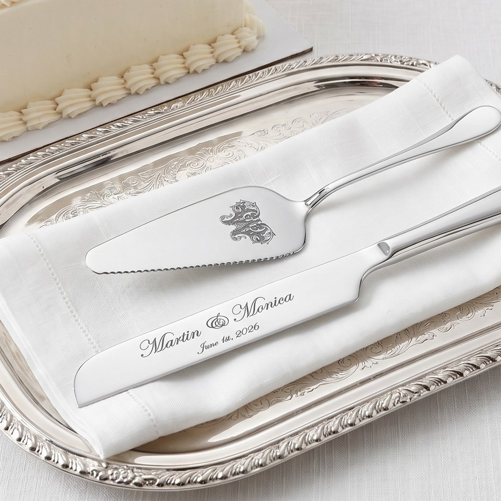 Die Klinge und der Spatel im stromlinienförmigen Metalldesign sind hochglanzpoliert, um eine hochwertige, glänzende Oberfläche zu erzielen. Der klassische tropfenförmige Griff bietet einen bequemen Halt. Der Spatel kann mit den Namen des Paares, dem Hochzeitsdatum und einzelnen Buchstaben im Vintage-Stil personalisiert werden, um exquisite Details hervorzuheben und die feierliche Atmosphäre zu unterstreichen.