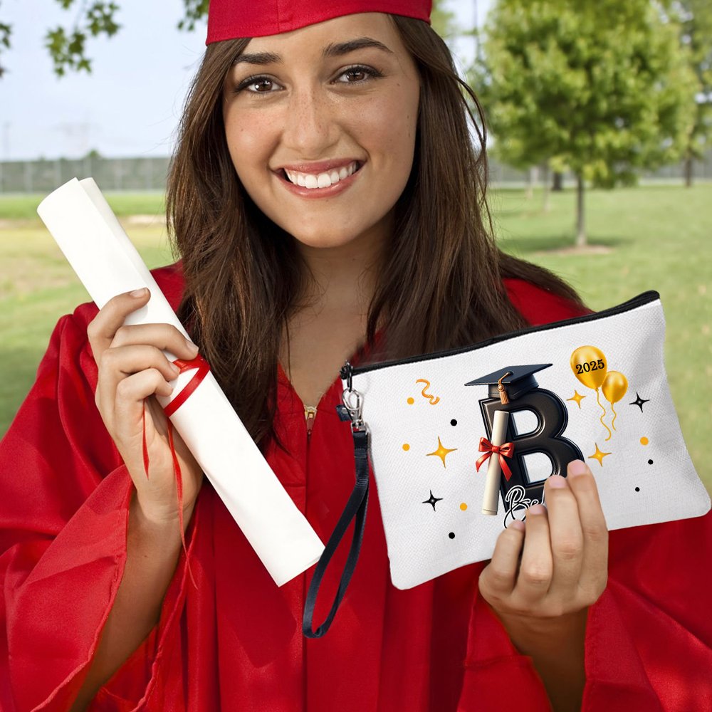 Diese Tasche zeigt ein anpassbares Initial mit einer Abschlussmütze vor einem festlichen Hintergrund aus goldenen Ballons. Sie kann auch mit einem Namen personalisiert werden. Das Design ist in elegantem Schwarz oder Gold erhältlich, und die Tasche gibt es in verschiedenen Farben, was sie zu einem einzigartigen Geschenk für Absolventen macht.