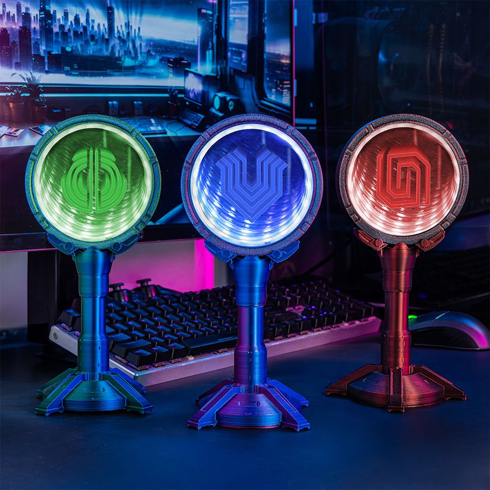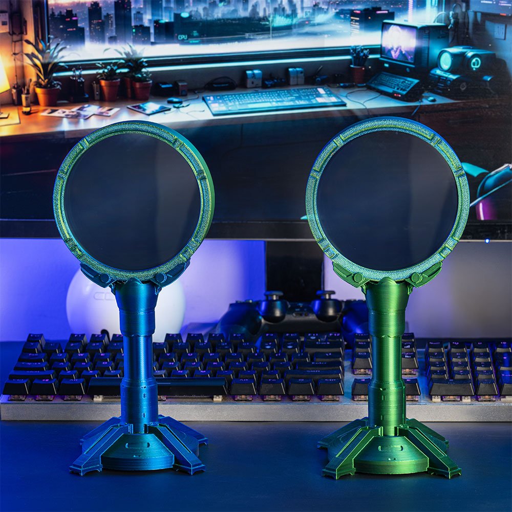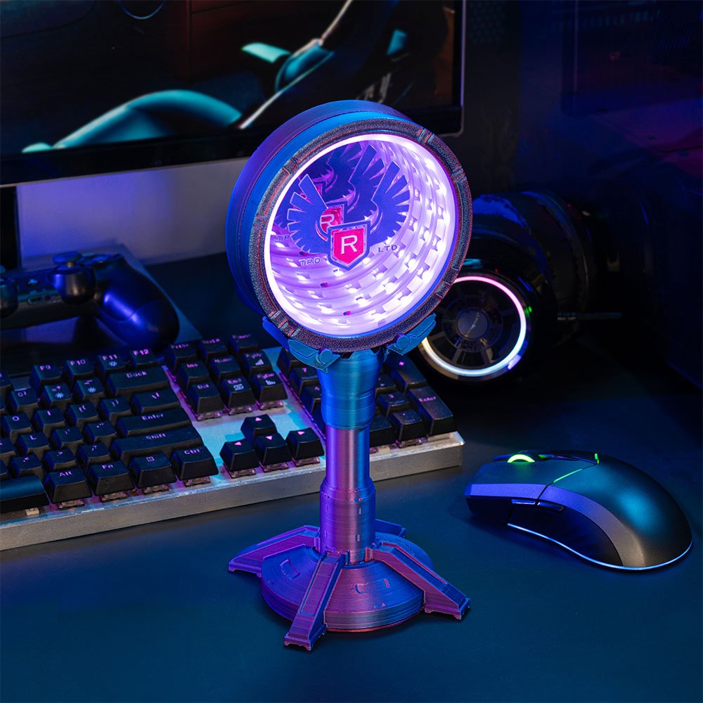 Dieser Kopfhörerständer besticht durch seine Cyberpunk-Ästhetik mit futuristischen Designelementen, die einen starken Sinn für Technologie und Stil ausstrahlen. Die coolen Lichteffekte und das tiefe Spiegeldesign verstärken seinen modernen Reiz und machen ihn zu einem herausragenden Stück für jedes Setup.