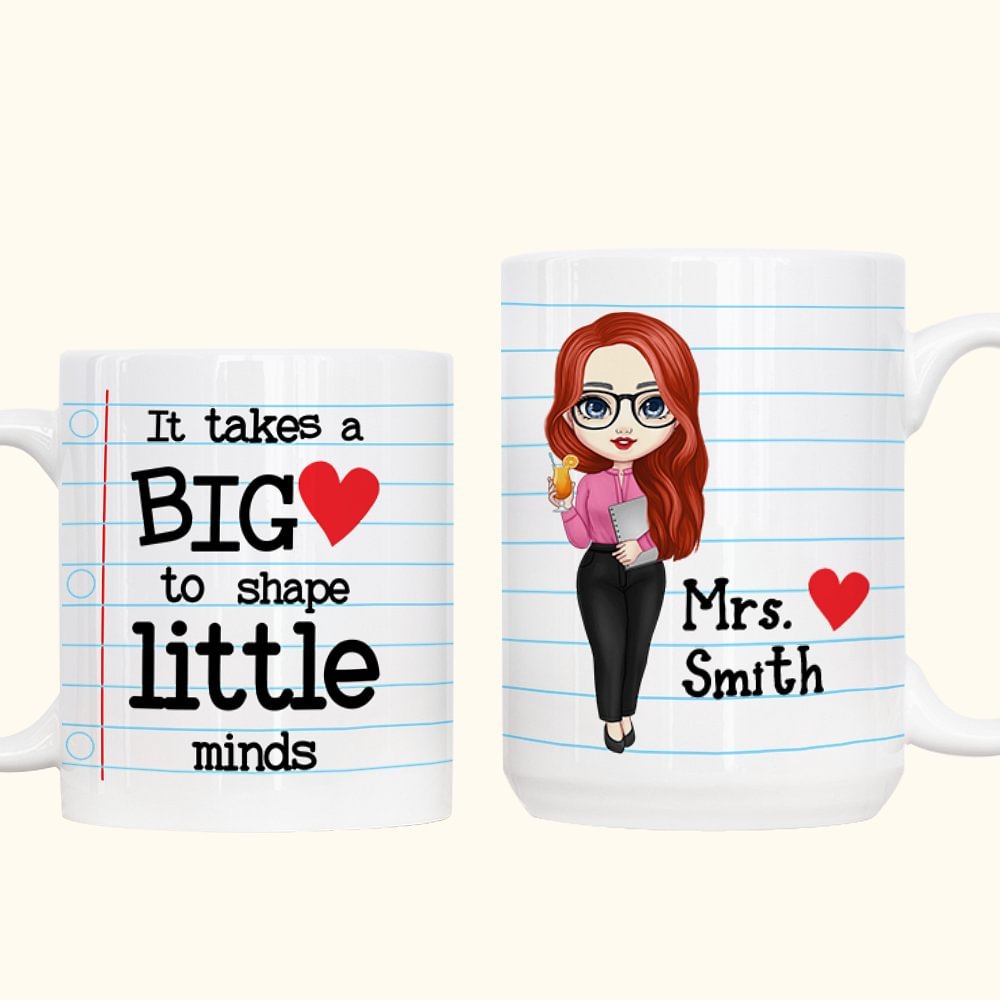 Auf dieser Tasse steht der rührende Satz "It takes a big heart to shape little minds", der das Engagement und die Wirkung von Lehrern hervorhebt. Sie können die Tasse mit dem Cartoon-Bild des Lehrers und seinem Namen versehen, was sie zu einem bedeutungsvollen Andenken macht.