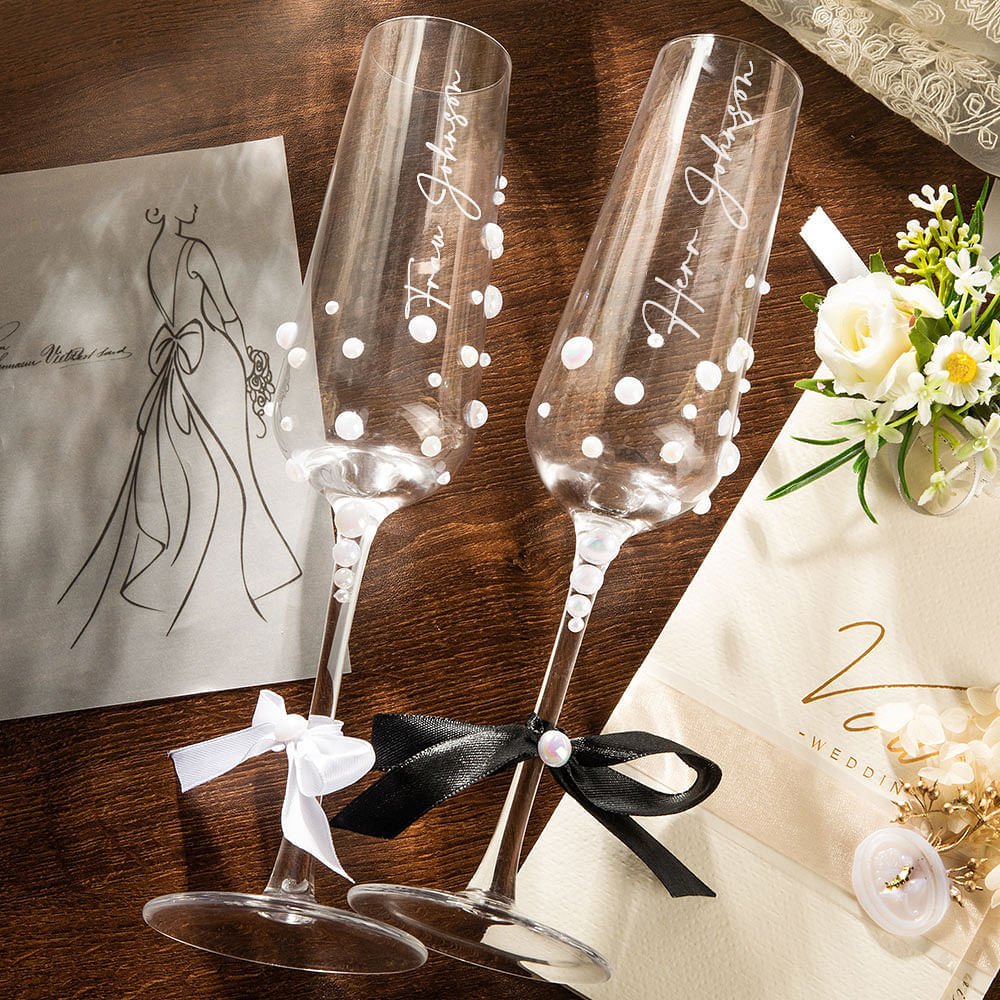 Die Perlen-Champagnergläser mit langem Stiel haben ein schönes und edles Design. Jede Perle wird von Hand auf das Glas geklebt, was bedeutet, dass jede Sektflöte ein Unikat ist. Das Perlenfinish verleiht ihnen einen Hauch von Raffinesse und macht sie perfekt für besondere Anlässe wie Hochzeiten oder Jubiläumsfeiern.