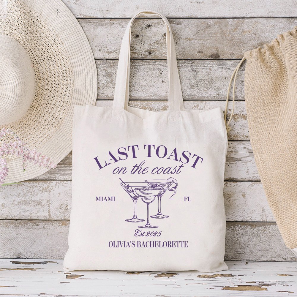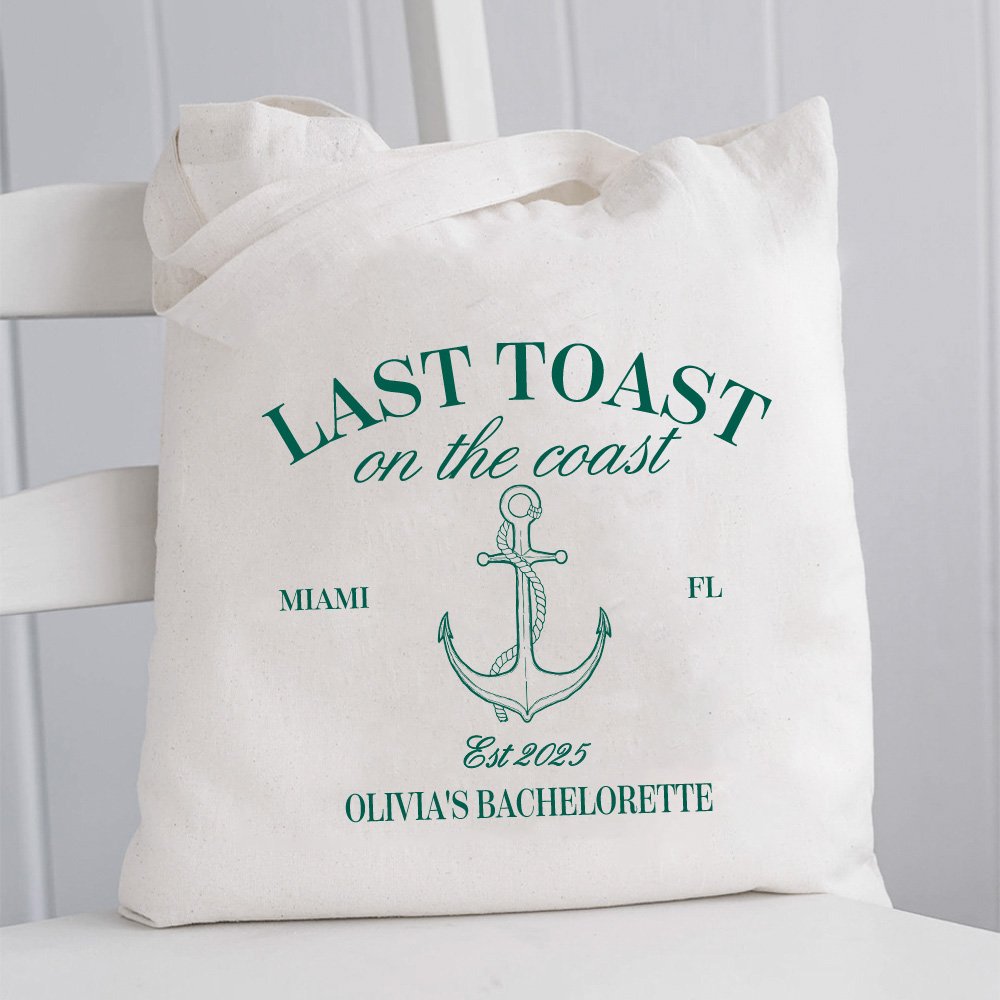 Unsere Tragetasche trägt den einprägsamen Slogan "Last Toast on the Coast". Mit der Möglichkeit, die Tasche mit einer Jahreszahl, einer Abkürzung des Bundesstaates, dem Namen der Stadt, dem Namen oder einer besonderen Nachricht zu versehen, verbindet diese Tasche den Geist Ihrer Küstenfeier nahtlos mit Eleganz und Spaß.
