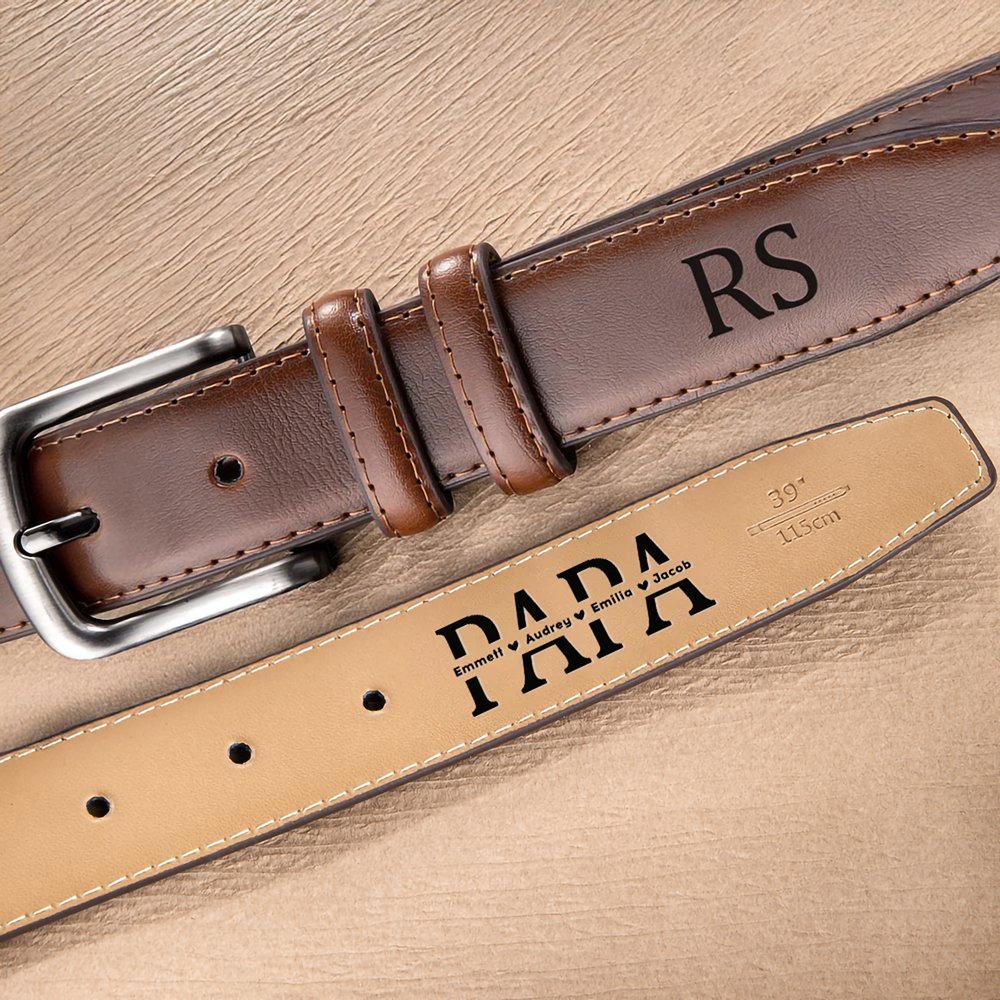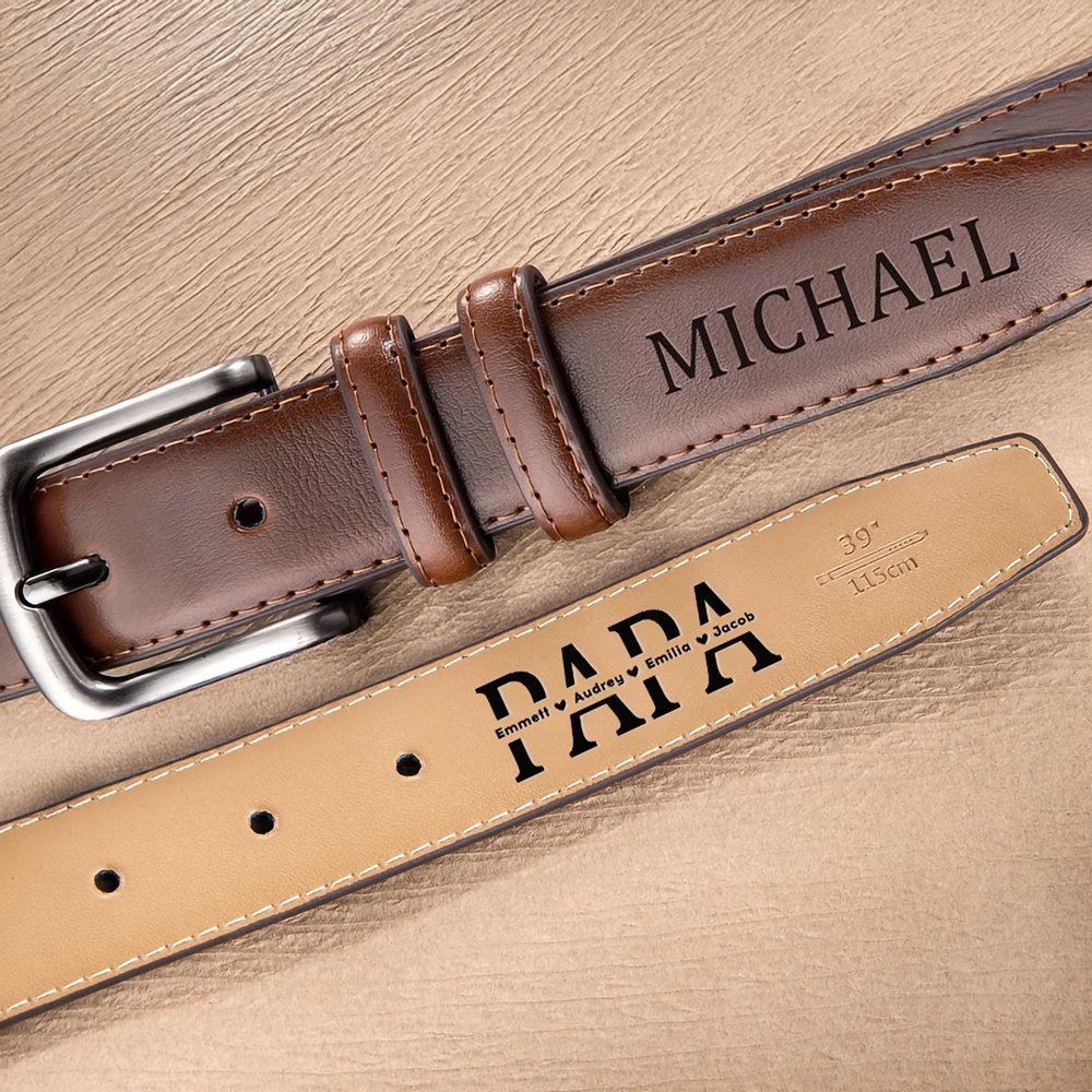 Dieser Gürtel ist in vier Farben erhältlich, um den unterschiedlichen Vorlieben und Bedürfnissen gerecht zu werden. Auf der Vorderseite kann der Name des Vaters eingraviert werden, während die Rückseite Platz für Kosenamen und die Namen von bis zu 12 Kindern oder Familienmitgliedern bietet – ein Ausdruck tiefer familiärer Verbundenheit.
