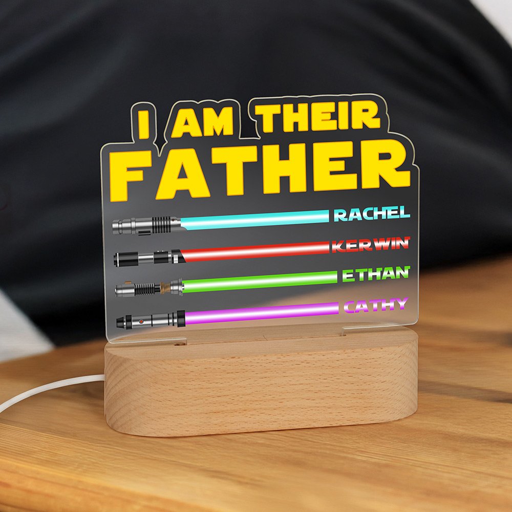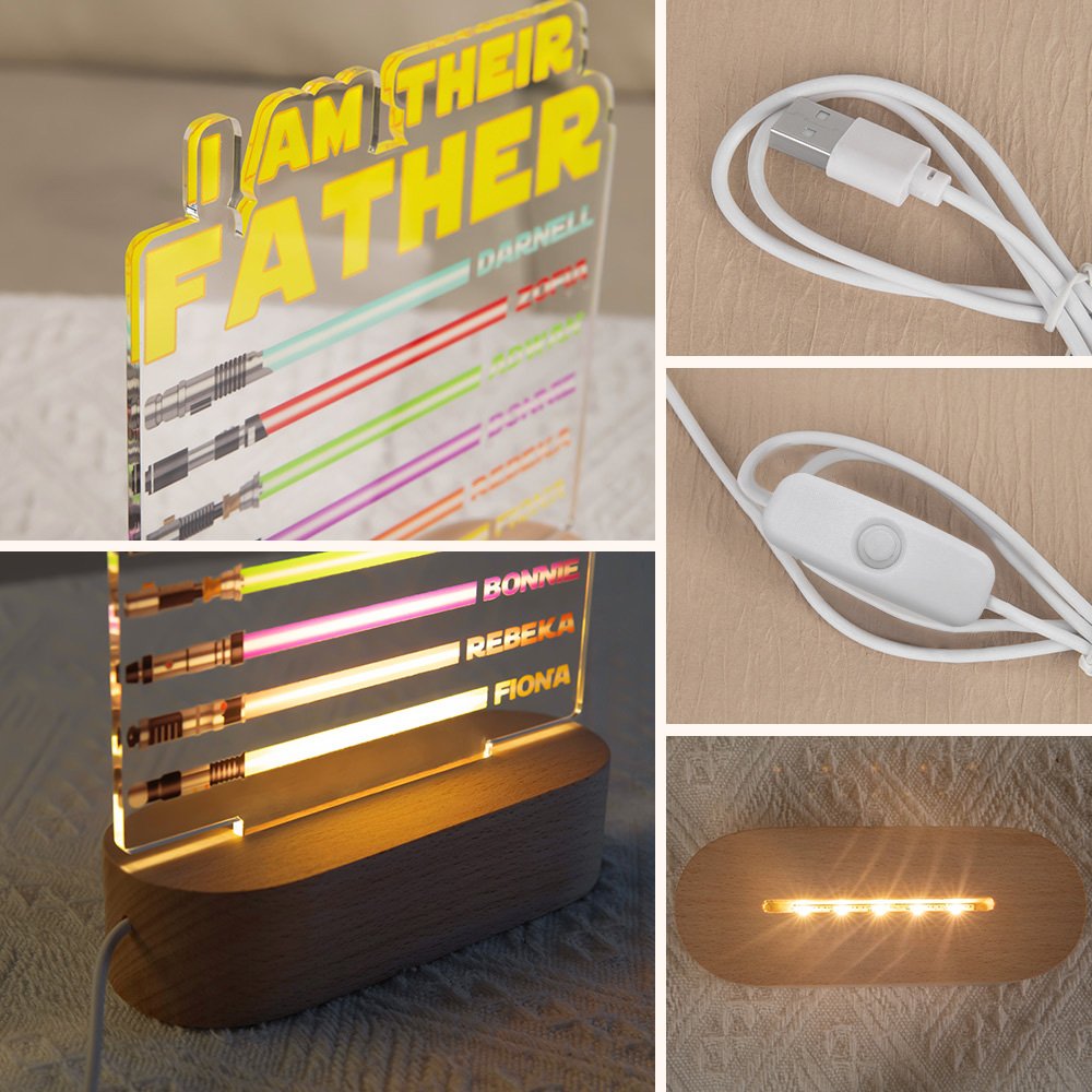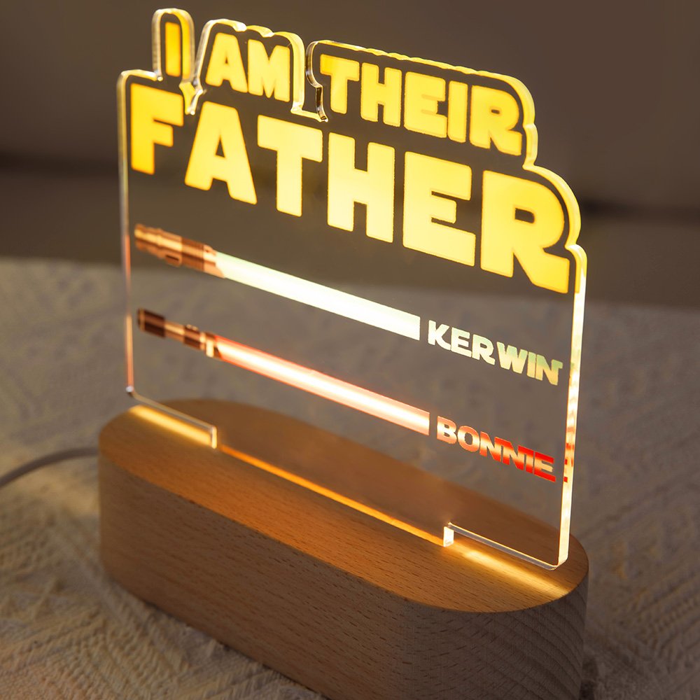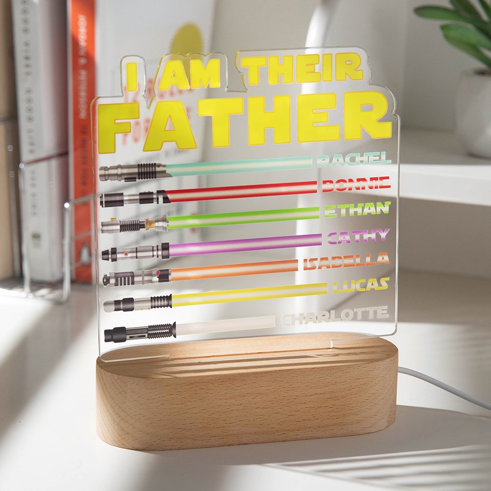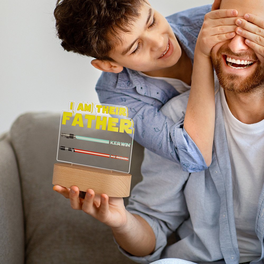Das Nachtlicht ist mit dem auffälligen Text "I AM THEIR FATHER" gestaltet. Darunter können 1-7 Lichtschwerter in verschiedenen Farben individuell gestaltet werden, wobei der Name des Kindes neben jedem Lichtschwert eingraviert ist. Dieses Design spiegelt nicht nur die enge Verbindung zwischen Vätern und Kindern wider, sondern verleiht dem Nachtlicht auch eine einzigartige Erinnerungsbedeutung.