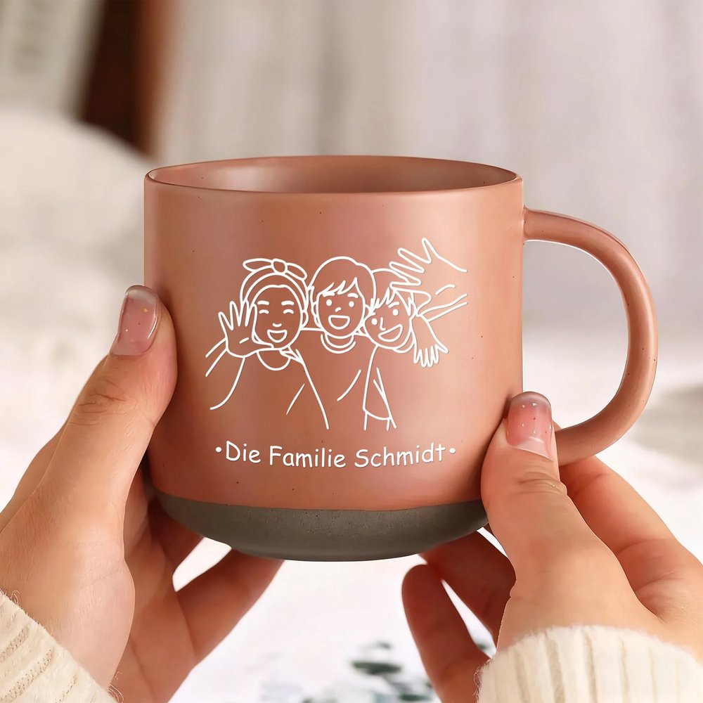Ihr hochgeladenes Familienfoto wird in eine saubere, künstlerische Strichgrafik umgewandelt, gepaart mit einem individuellen Familiennamen wie Die Familie Müller. So wird jede Tasse zu einem einmaligen Andenken mit persönlicher Bedeutung.