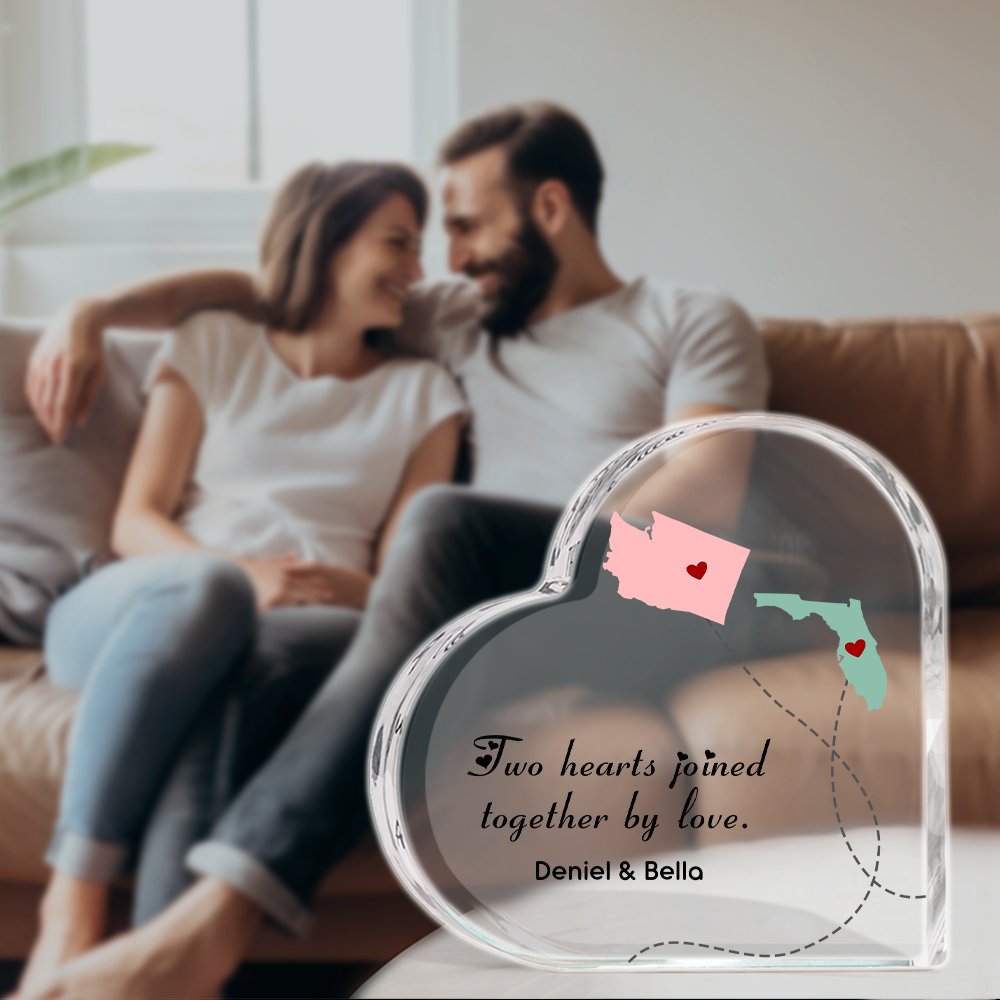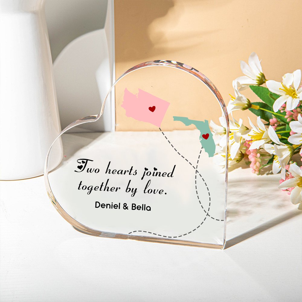 Die Acryltafel ist mit einem Kartendesign bedruckt, und Sie können den Namen entsprechend Ihrem Standort wählen. Die Tafel kann auch mit den Worten "Two Hearts Joined together by love"