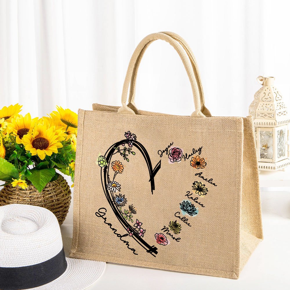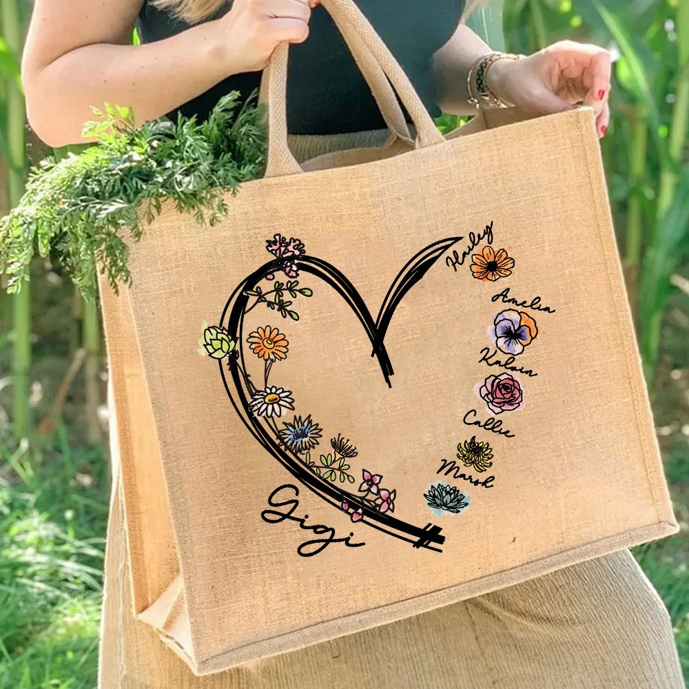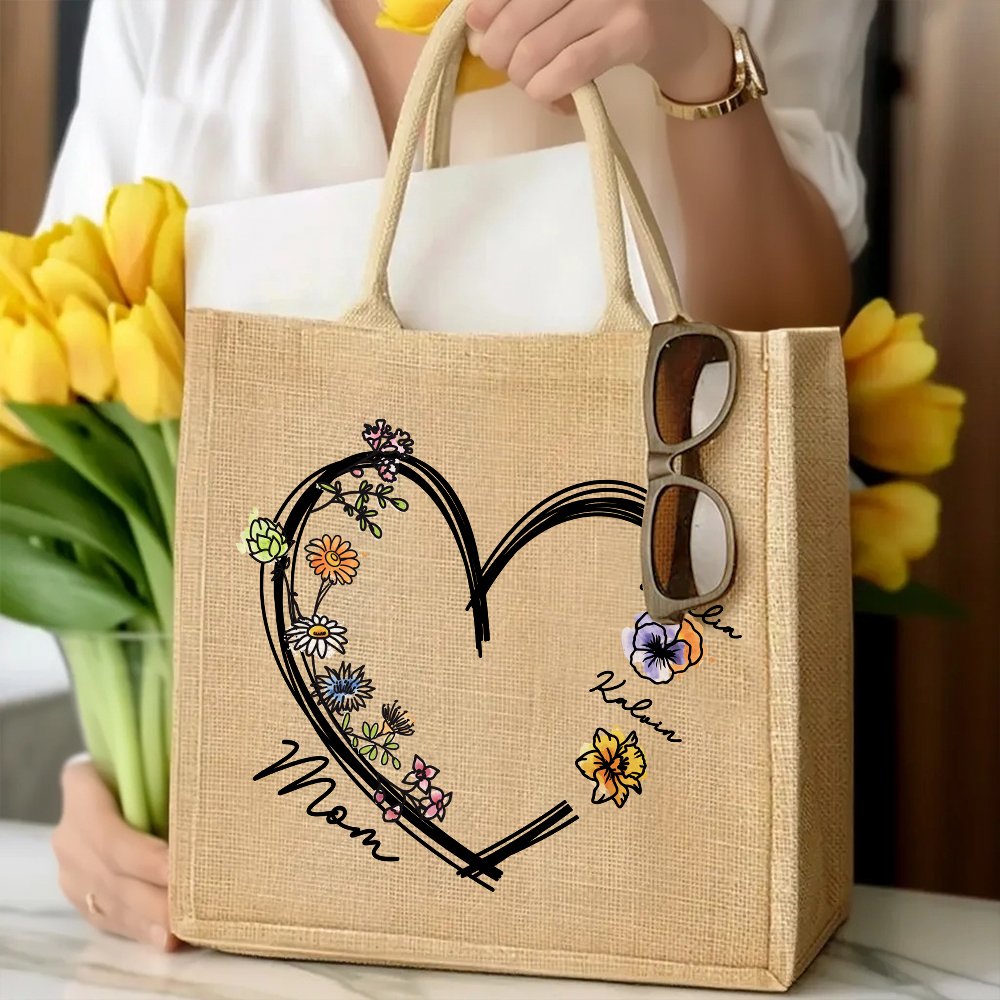 Diese Tragetasche aus Jute hat ein extragroßes Herzmotiv, das von einem Kreis aus Geburtsblumen umrandet wird. Sie können je nach Bedarf 1-6 Geburtsblumen auswählen und einen Spitznamen für Ihre Mutter oder Großmutter unter den gewählten Blumen angeben, was die Tasche zu einem einzigartigen und stilvollen Accessoire macht.