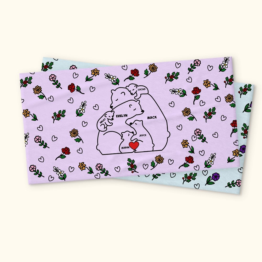 Dieses Strandtuch zeigt eine Familie von Bären, die sich umarmen, umgeben von Blumen und Herzen, die eine liebende Familie symbolisieren. Sie können 2-9 Bären, jeder mit einem Namen und entsprechenden Geburtstagsblumen anpassen, um Sie daran zu erinnern, dass Liebe und Unterstützung halten Sie Ihre Familie zusammen in guten und schlechten Zeiten.