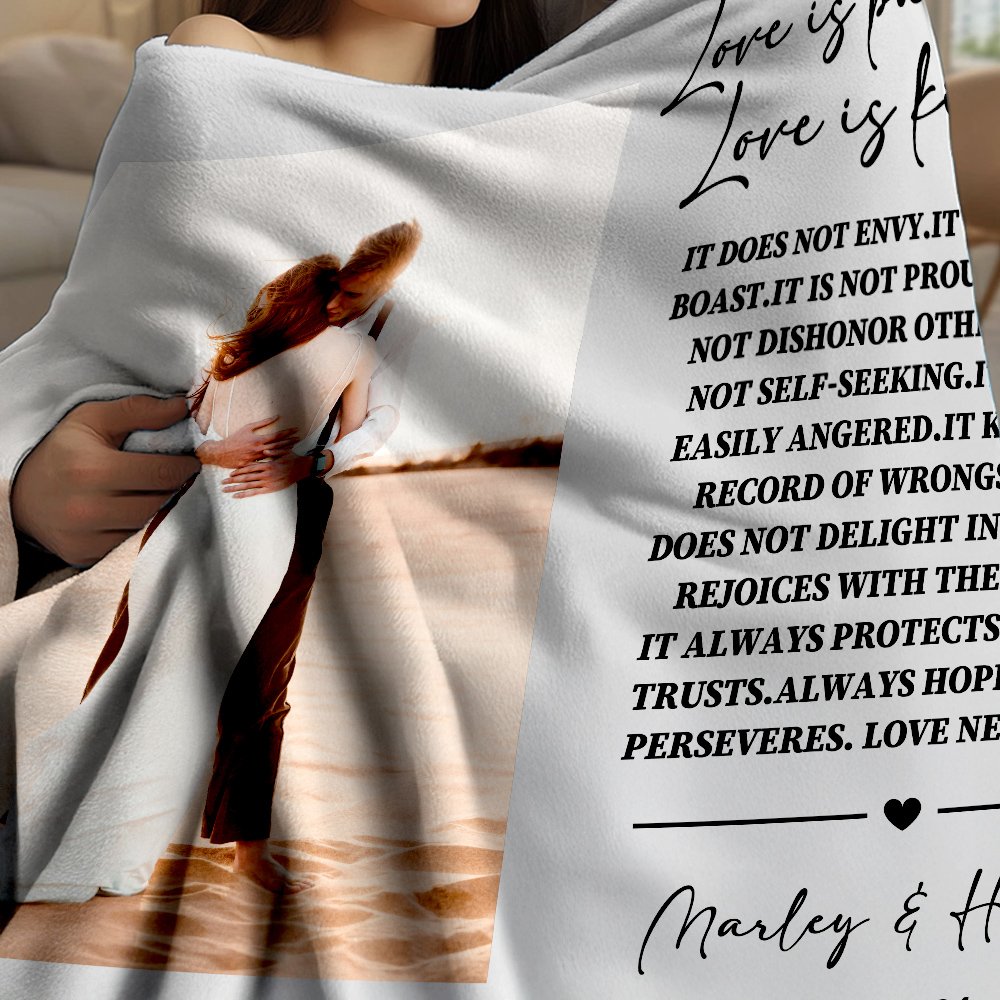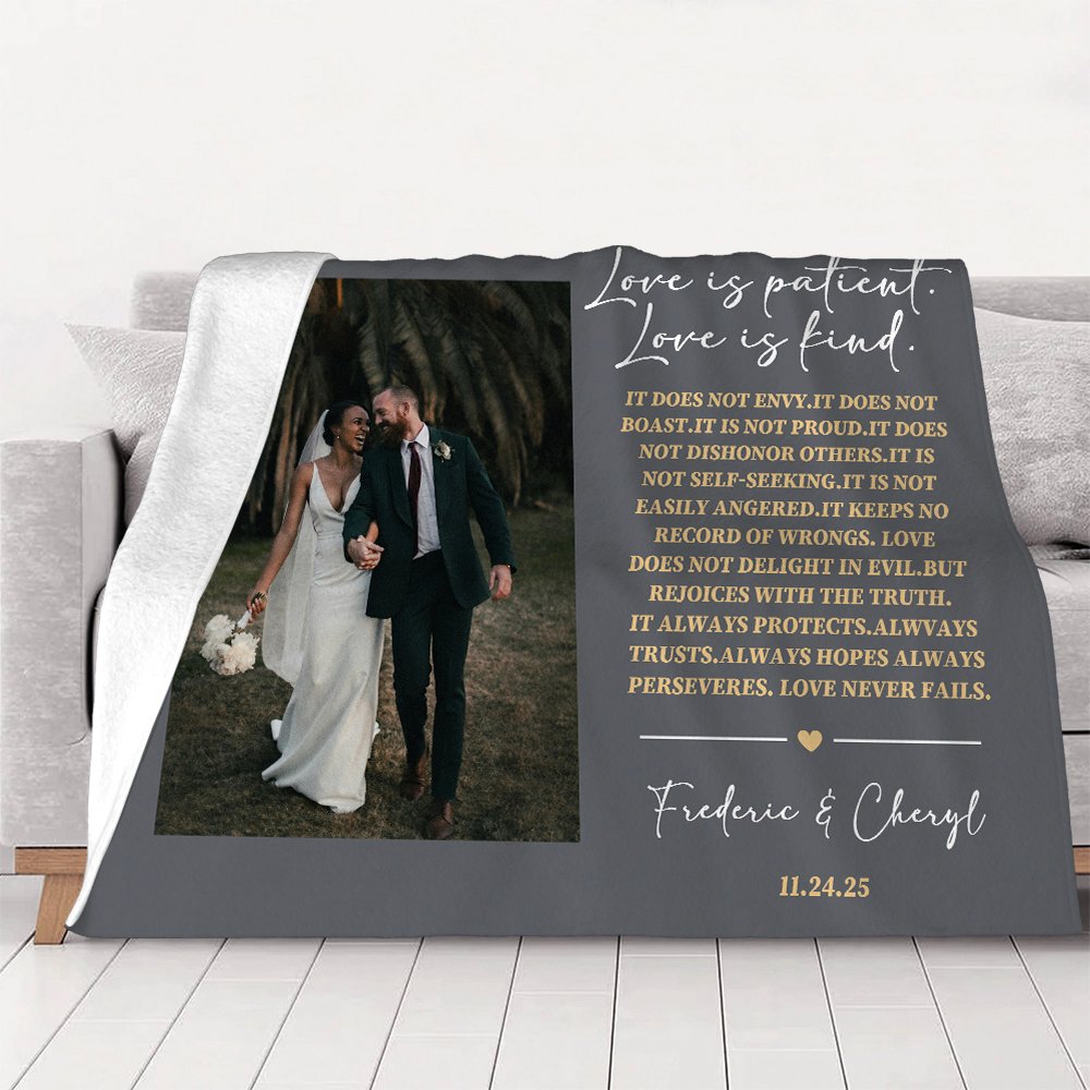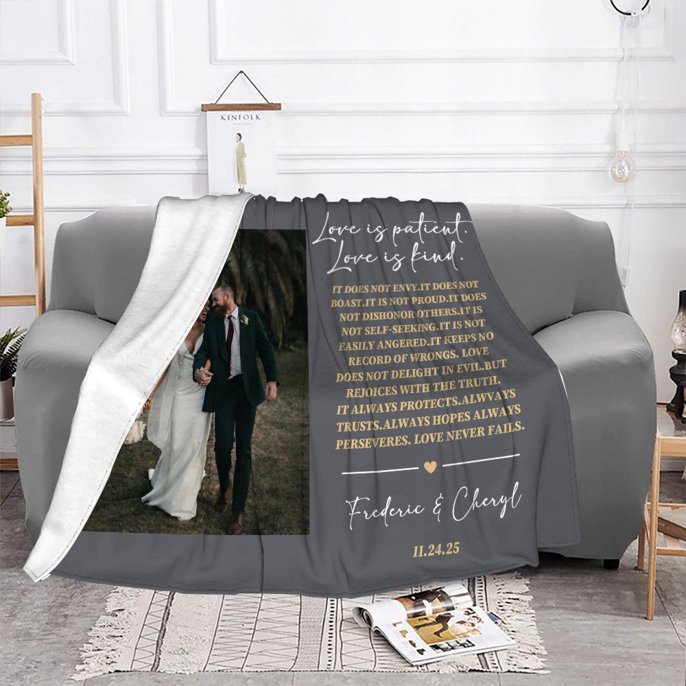 Auf diese Decke können Sie Fotos hochladen, mit dem romantischen Slogan "Love is Patient, Love is Kind" und der Definition von Liebe, schön und süß. Sie können Ihren Namen und das Datum auf sie anpassen, um es noch glücklicher zu machen.