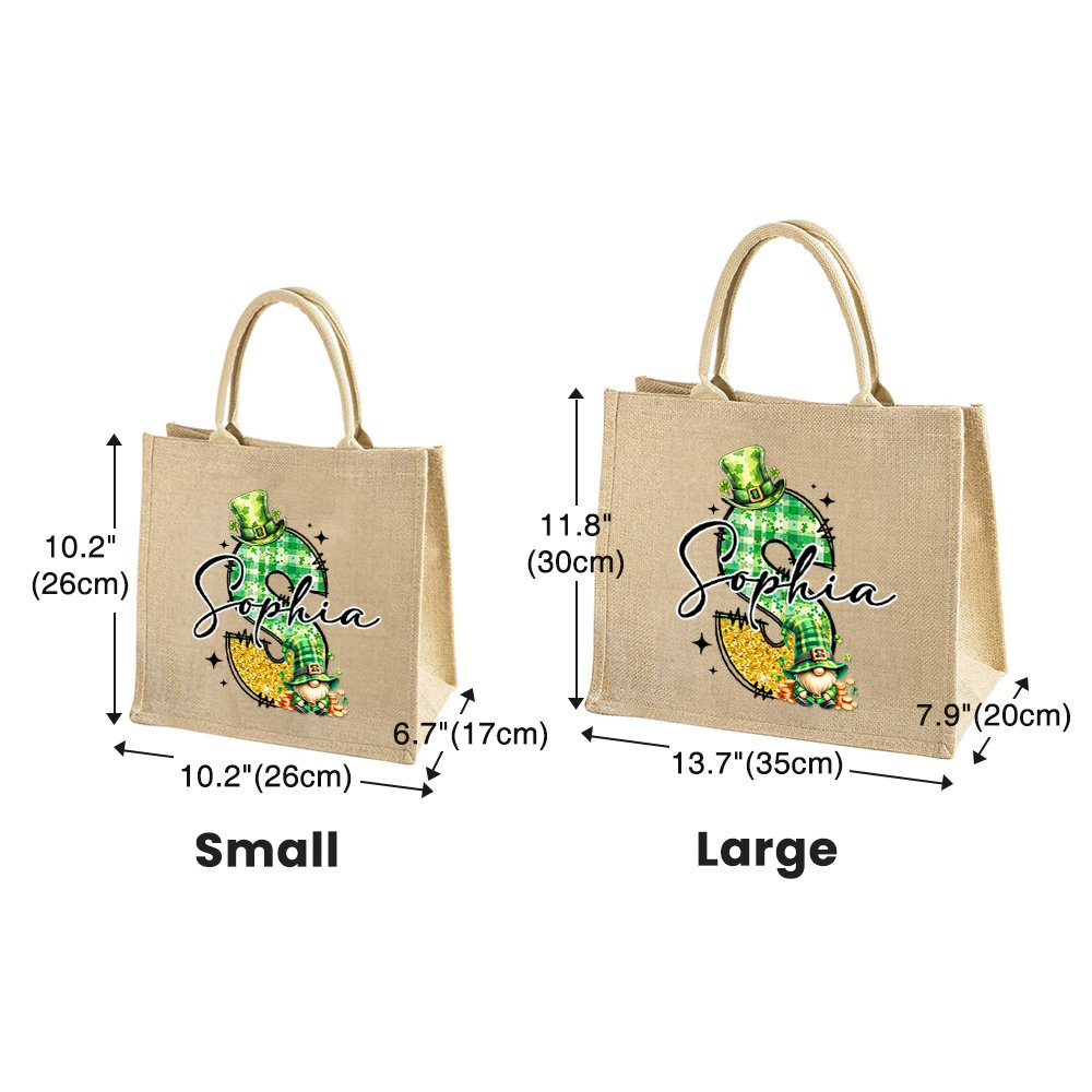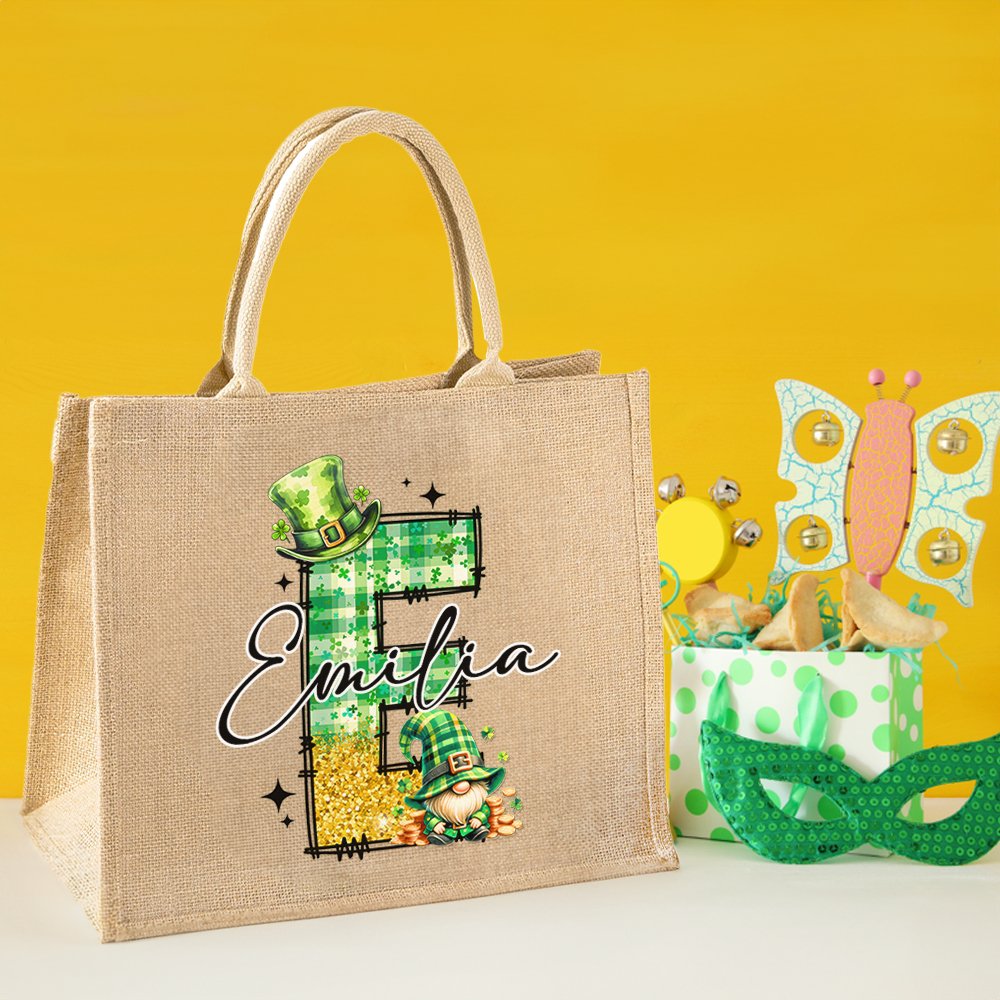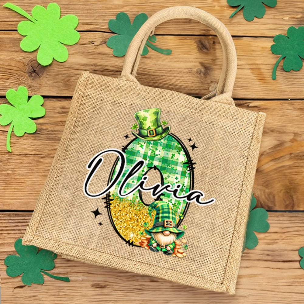 Das Thema unserer Tragetasche ist der St. Patrick's Gnome, der die starken Merkmale der irischen Kultur widerspiegelt. Eine anpassbare Initiale auf der Tasche sowie ein Gnom, eine Mütze und ein Kleeblatt, die um die Tasche herum dekoriert sind, machen sie interessant. Sie können auch den Namen des Kindes auf der Tasche anbringen, um sie noch spezieller zu machen.