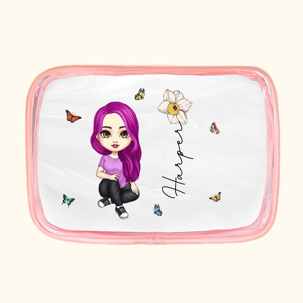 Personalisierte Weibliche Cartoonfigur Kosmetiktasche mit Namen Geburtsblume Transparent Wasserdicht Travel Essentials Hochzeit Party Urlaub Geschenk