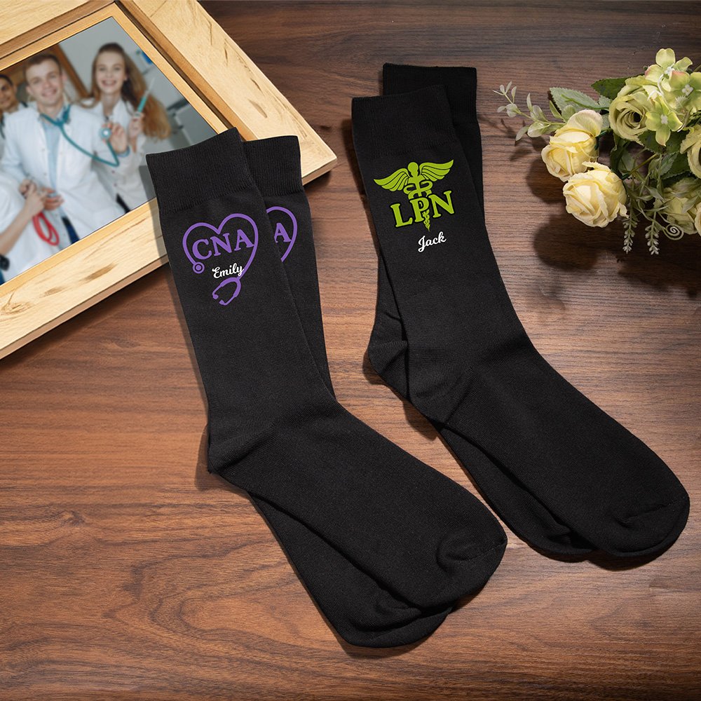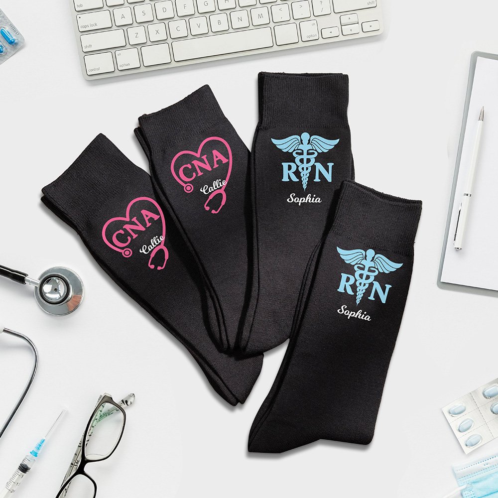 Diese auffälligen Socken zeigen klassische Totem-Designs wie Caduceus, Stethoskop und Apotheker, mit medizinischen Symbolen und Namen, um sie hervorzuheben und es jedem Mitarbeiter im Gesundheitswesen zu ermöglichen, seine Leidenschaft und seinen Stolz für seinen edlen Beruf stolz zu zeigen.