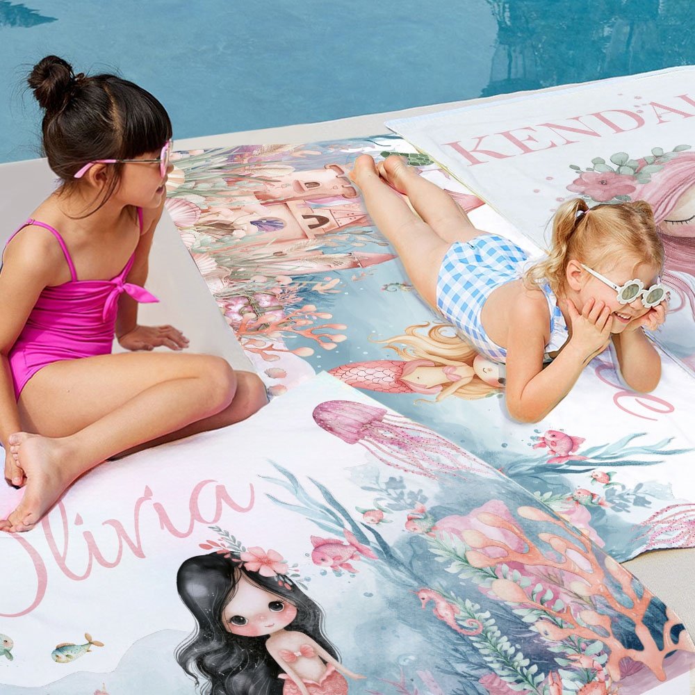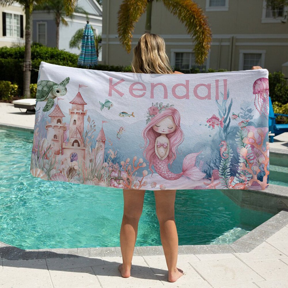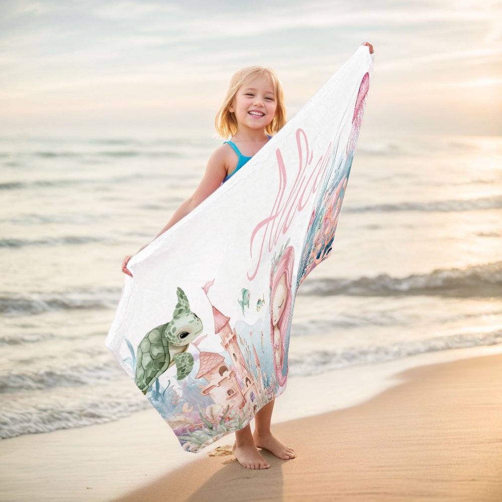 Das Design dieses Strandtuchs nutzt die Unterwasserwelt und Meerjungfrauen-Elemente, mit 13 verschiedenen Meerjungfrauen-Stilen, aus denen Sie wählen können. Sie können auch Ihren Namen darauf anpassen, um das Strandtuch unverwechselbar zu machen. Verspielte Farb- und Musterkombinationen sorgen für Spaß und Stil bei Ihrem Strandausflug.