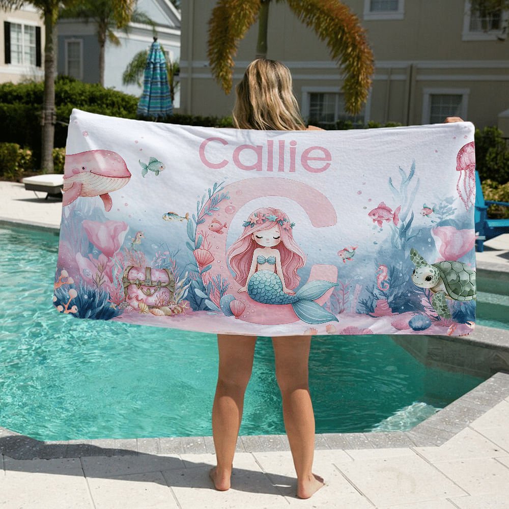 Dieses Meerjungfrauen-Strandtuch mit bunter Meeresflora und -fauna, darunter Quallen, Fische und Krabben, kann mit Namen und Initialen individuell gestaltet werden. Stellen Sie sich niedliche Meerjungfrauen vor, die in den türkisfarbenen Wellen springen, und süße Quallen, die zwischen bunten Korallen und Meeresbewohnern schwimmen. Es ist eine fantasievolle Leinwand, die die Kreativität und Neugier junger Entdecker anregt.