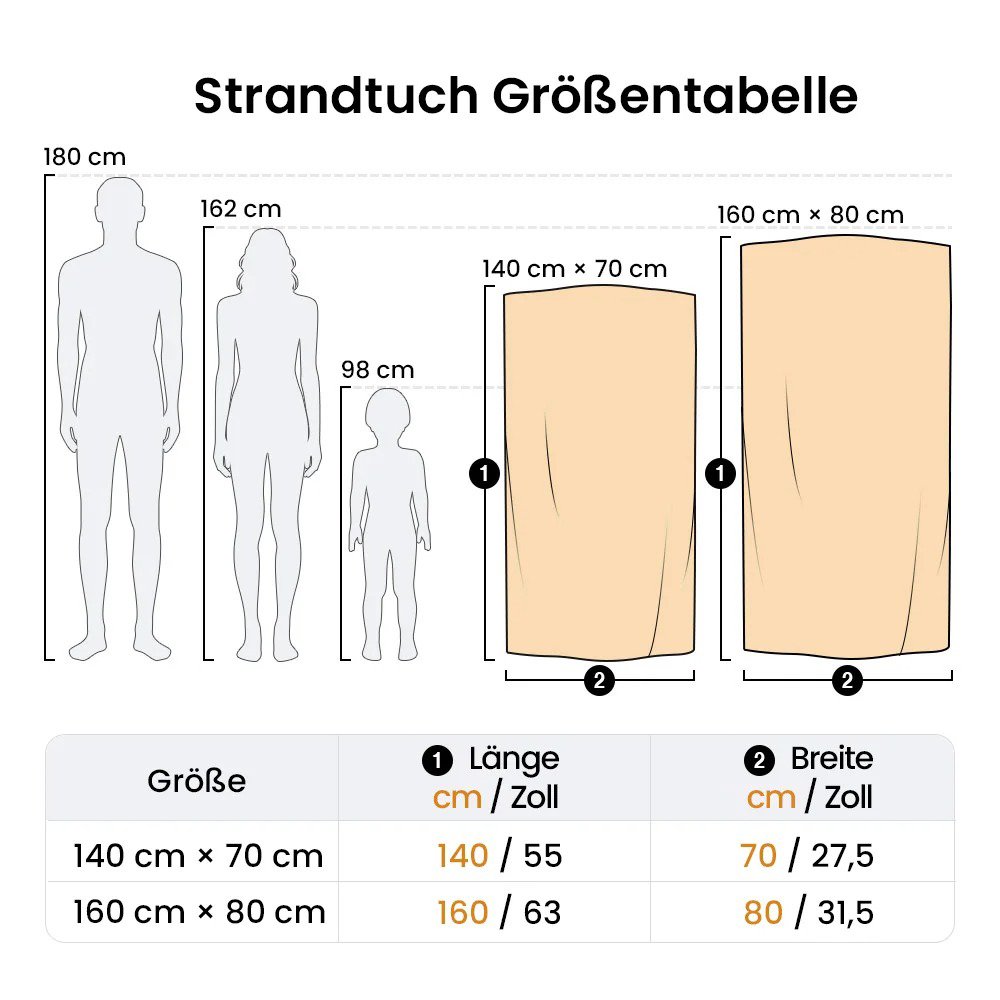 Das aus hochwertiger Mikrofaser gefertigte Strandtuch fühlt sich weich an und ist auch für empfindliche Haut geeignet. Es verfügt außerdem über eine hervorragende Wasseraufnahmefähigkeit und eine schnelltrocknende Fähigkeit, die Feuchtigkeit effektiv absorbieren kann, sodass Sie nach dem Einweichen trocken und komfortabel bleiben. Außerdem ist dieses Strandtuch leicht, sodass es sich einfach zusammenfalten und transportieren lässt, und es ist perfekt für Ihre Strandaktivitäten geeignet.